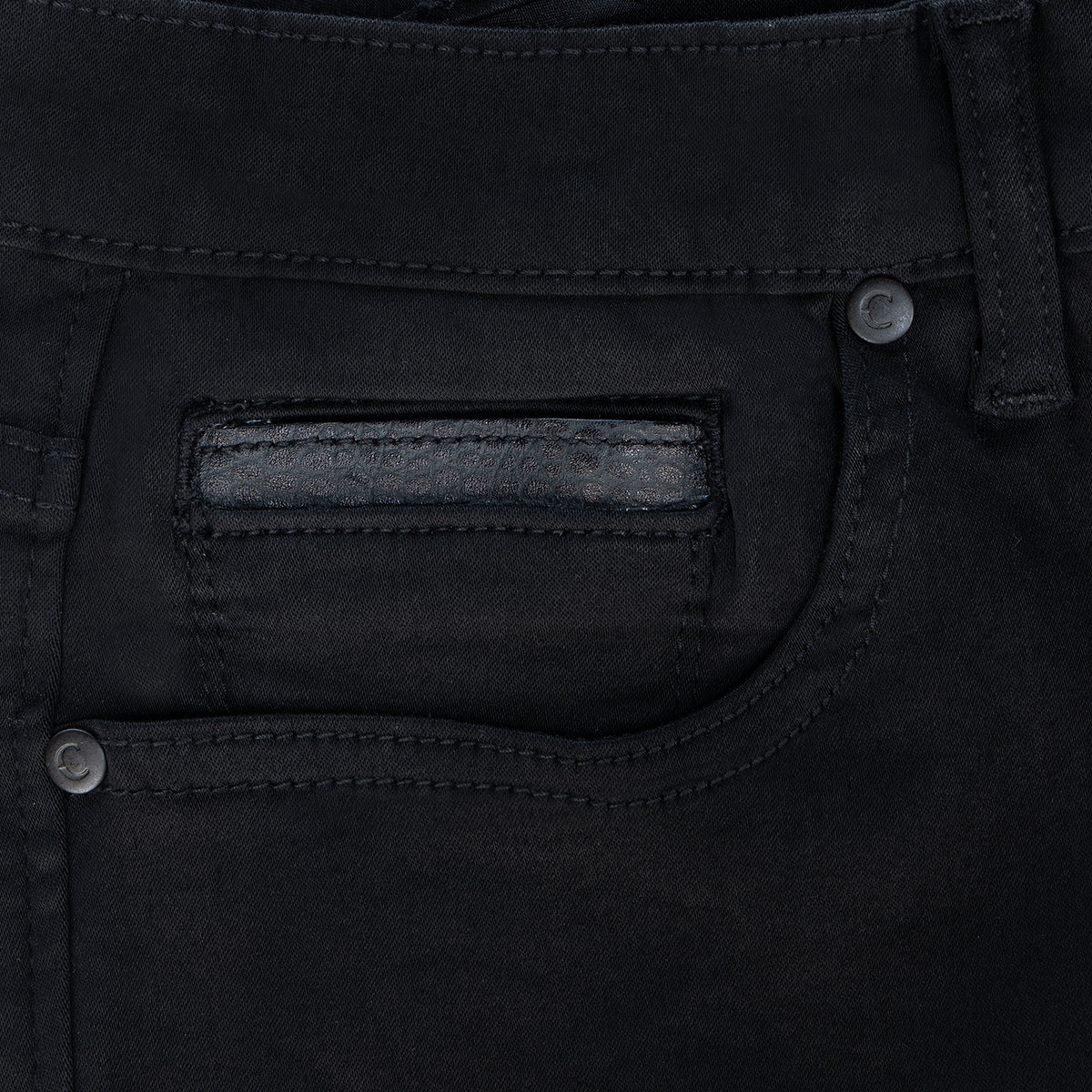 Jeans Cuadra para caballero. Presenta aplicación de hule y piel de bovino grabada en la parte trasera logotipo Cuadra. Stretch
