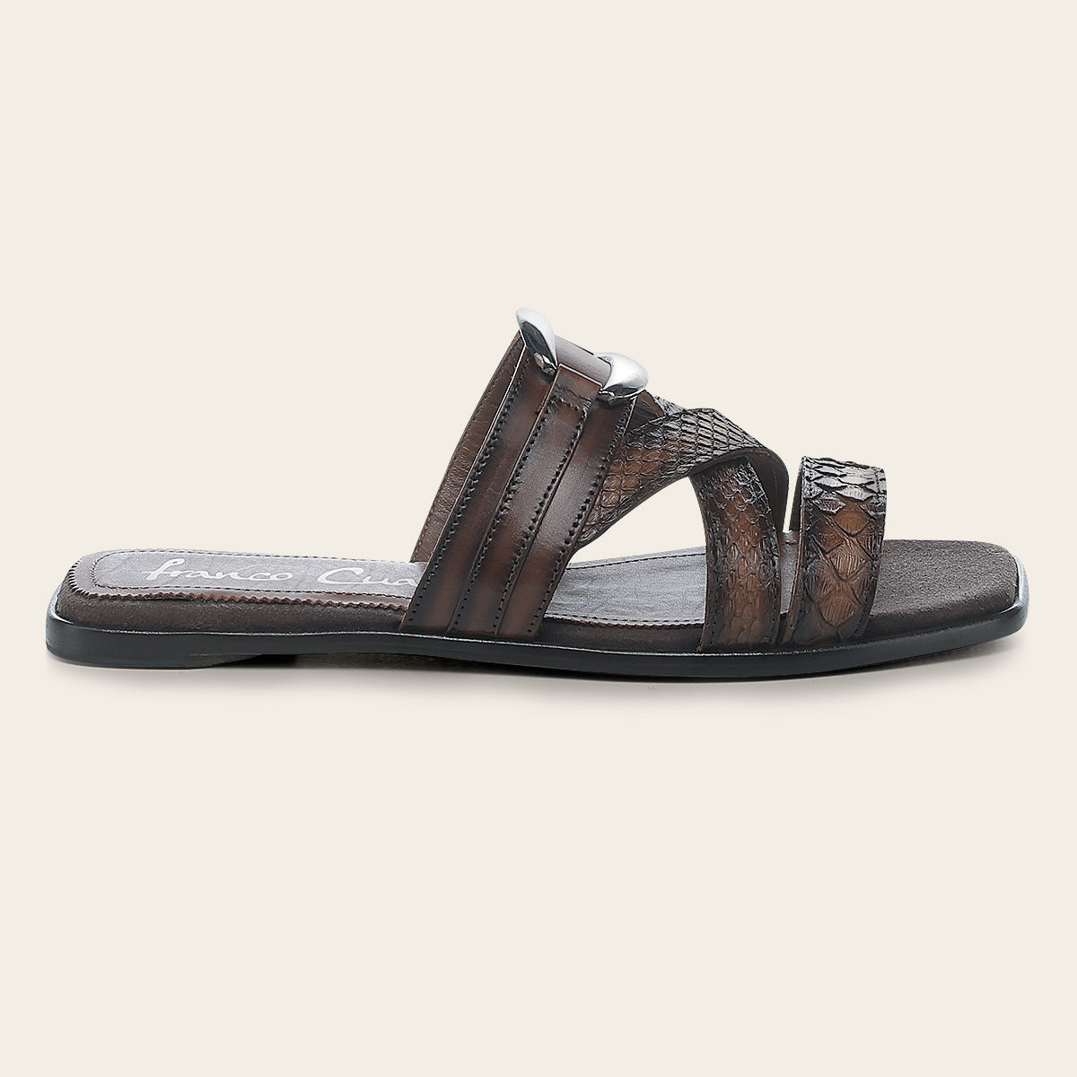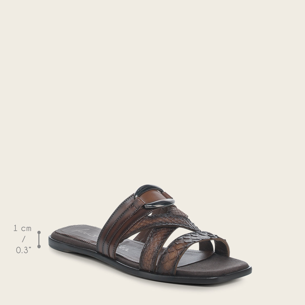 Sandalia slip-on para dama en piel genuina de pitón y piel de bovino. Presenta tiras de piel con hebilla metálica decorativa. Cuenta con una plantilla Ortholite reconocida por su transpirabilidad, amortiguación, control de humedad y confort. Con suela de cuero con injerto de TPU.