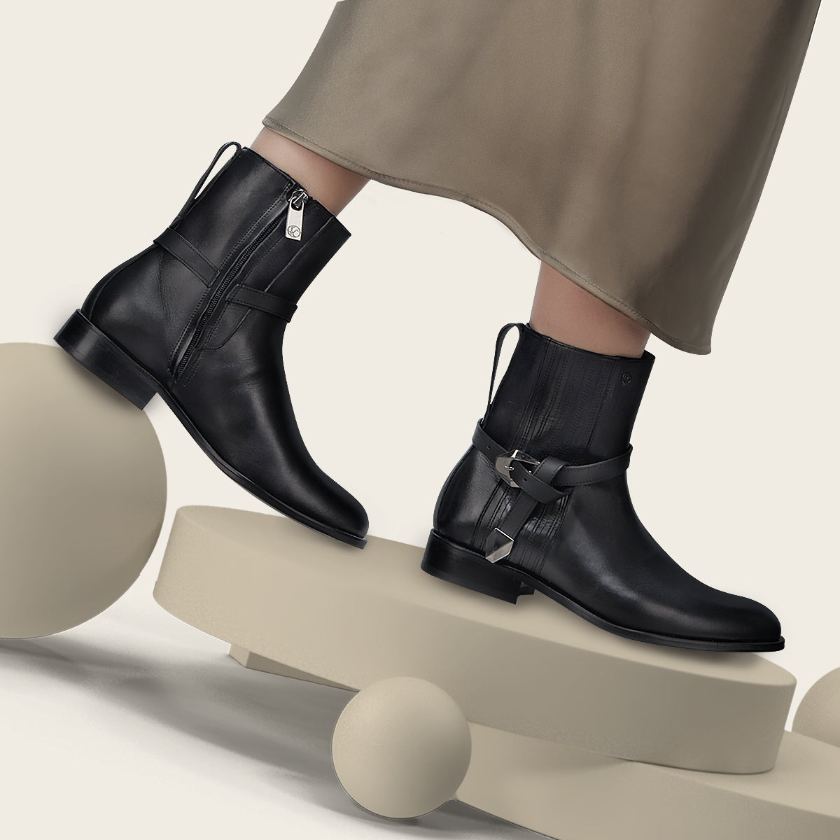 Botín de vestir para dama en piel genuina de bovino. Cuenta con tira de piel decorativa alrededor del tobillo, con terminaciones metálicas estilo western. Elástico en la parte lateral. Ajuste por medio de cierre interno. Con suela de cuero.