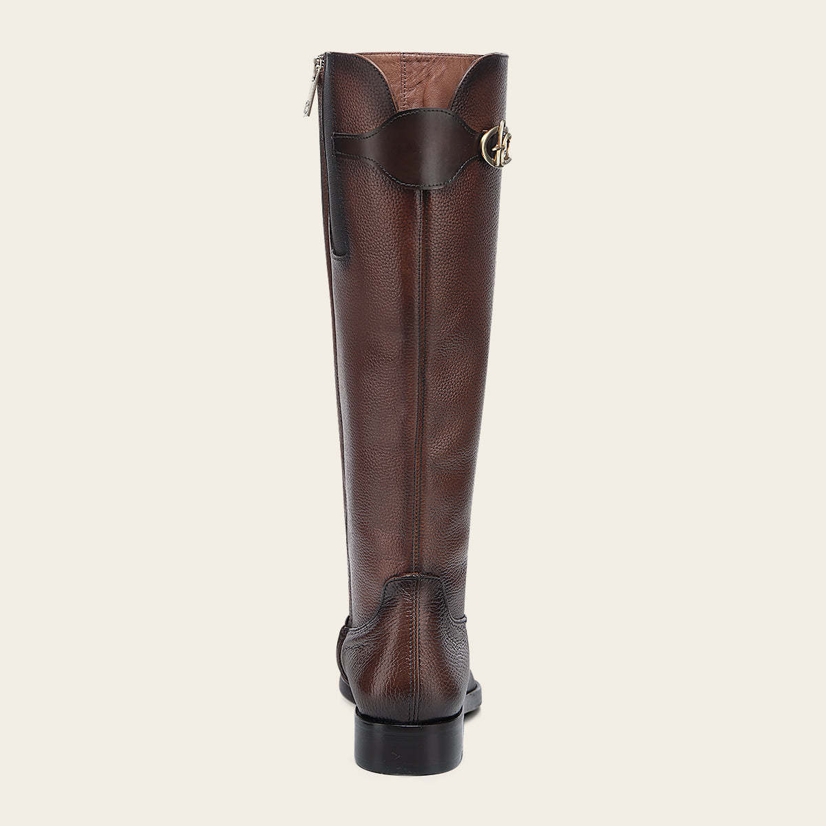 Bota para dama estilo ecuestre en piel genuina de venado y piel de bovino. Presenta sombreado a mano, herraje de monograma de Franco Cuadra sobre aplicación de piel de bovino en textura y color contrastante. Ajustada con cierre interno y aplicación elástica de textil para mejor ajuste. Suela de cuero de doble densidad con injerto de TPU.