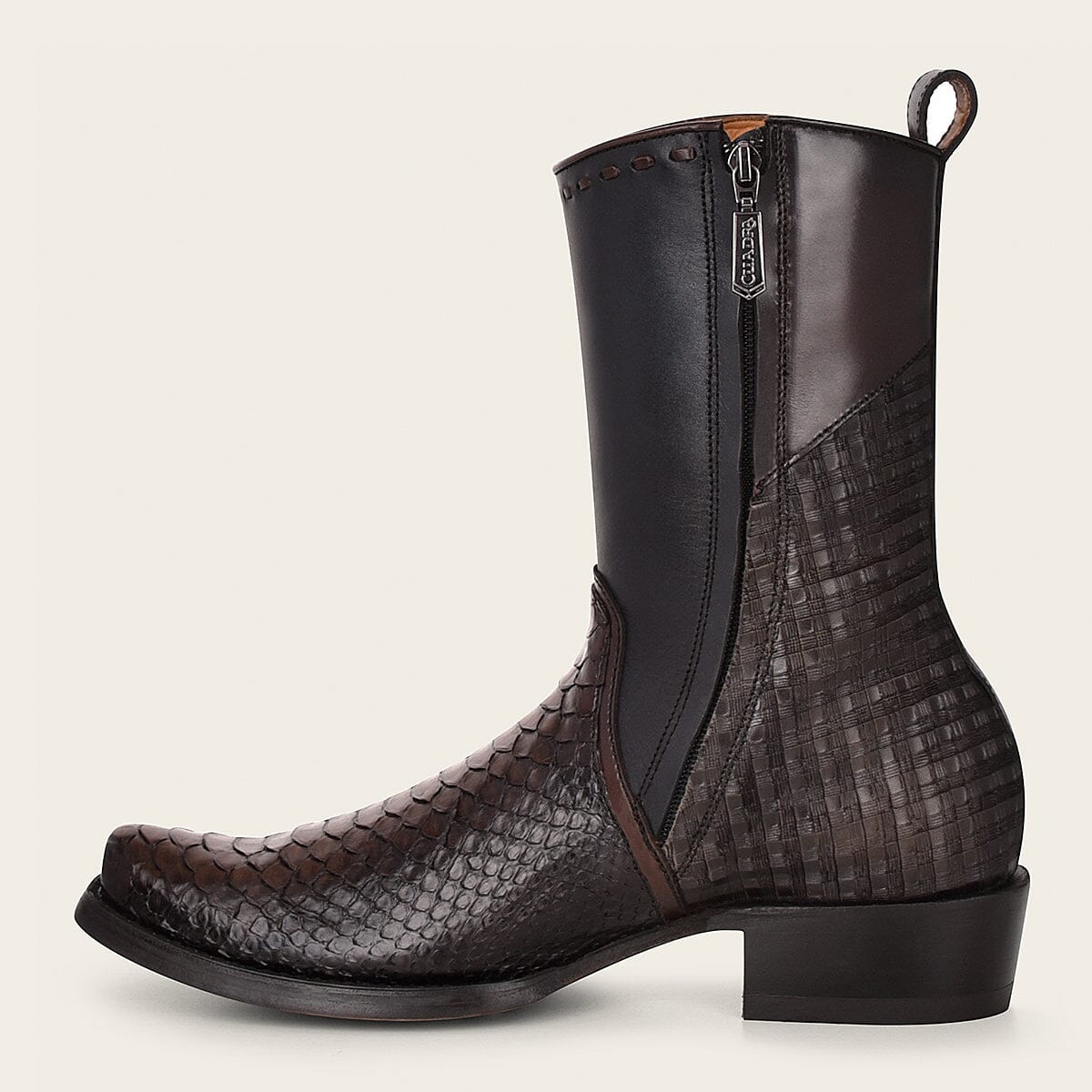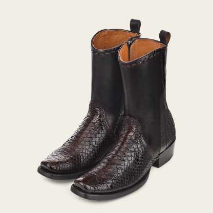 Bota para caballero en piel genuina de pitón. Con detalles de corte y grabado láser de logo Cuadra y detalles de tejido artesanal. Color negro.