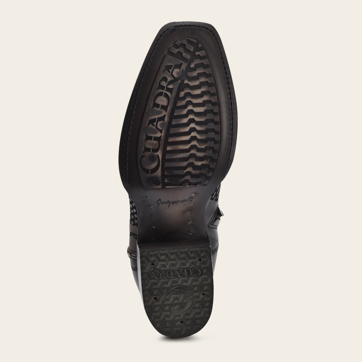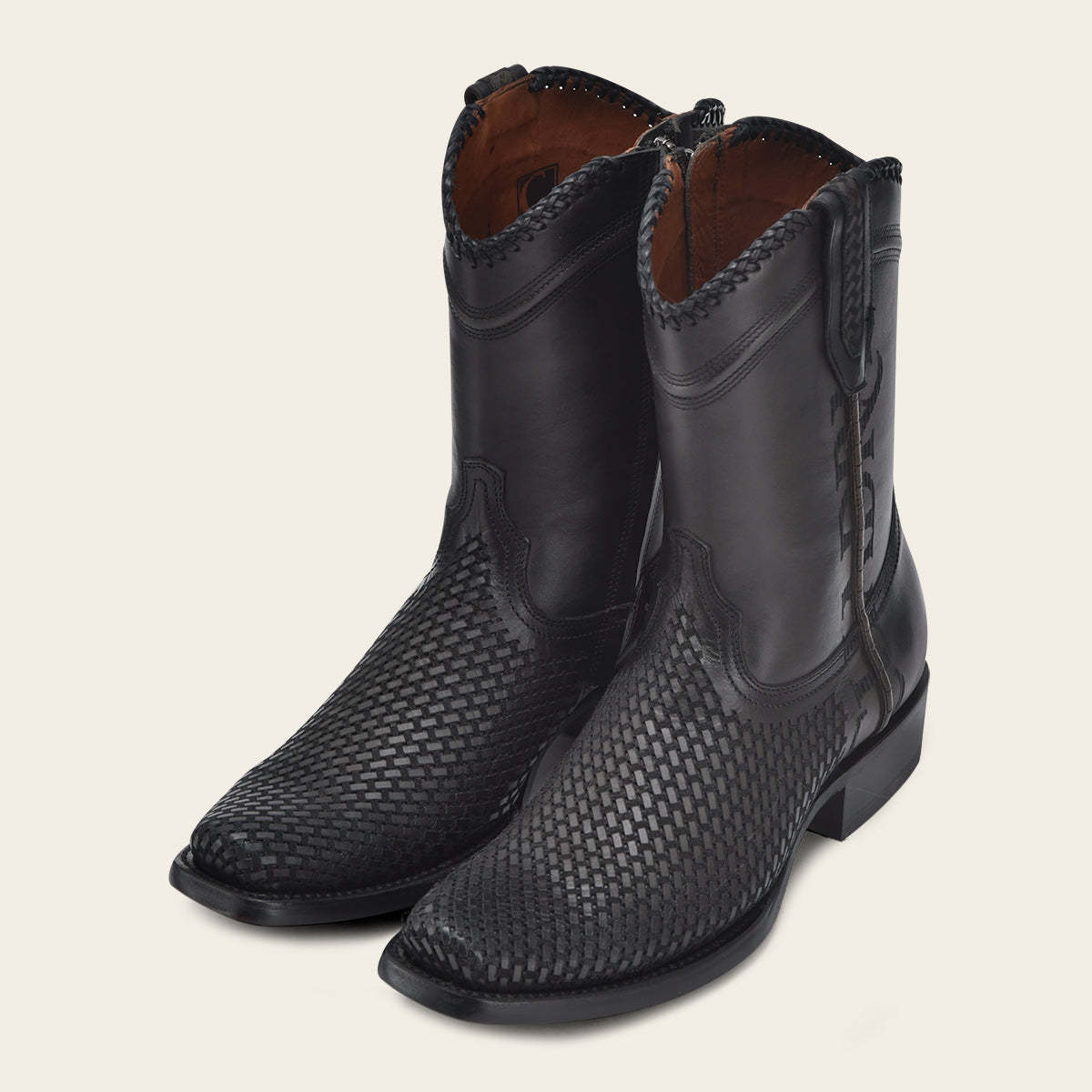Bota casual para caballero en piel genuina de bovino. Con grabado láser de logotipo Cuadra en tubo. Con piel tejida a modo artesanal al frente, en orejas y parte superior. Ajuste interno de cierre. Suela de cuero con TPU.