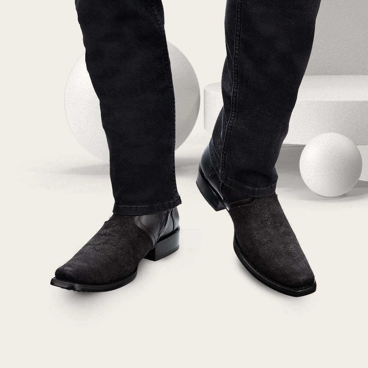 Bota para caballero en piel genuina de elefante. Al costado presenta detalles de brocado en la piel, así como una tira en piel de bovino con grabado Goodyear Welt. La parte superior cuenta con detalles de tejido de piel a modo artesanal. Con pequeña aplicación metálica del monograma Cuadra en la parte inferior. Ajuste por medio de cierre interno. Color oxford.