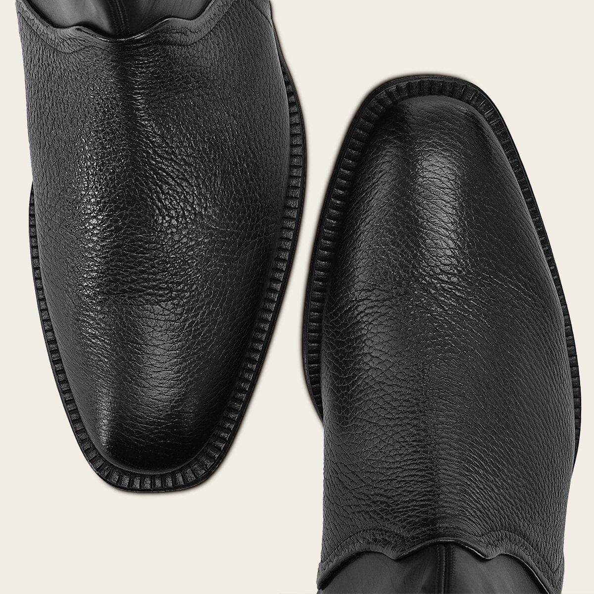 Botín de vestir para caballero en piel genuina de venado y piel de bovino. En un costado presenta aplicación metálica de monograma Franco Cuadra. Ajustado con cierre interno.  Con suela de cuero con injerto de TPU.