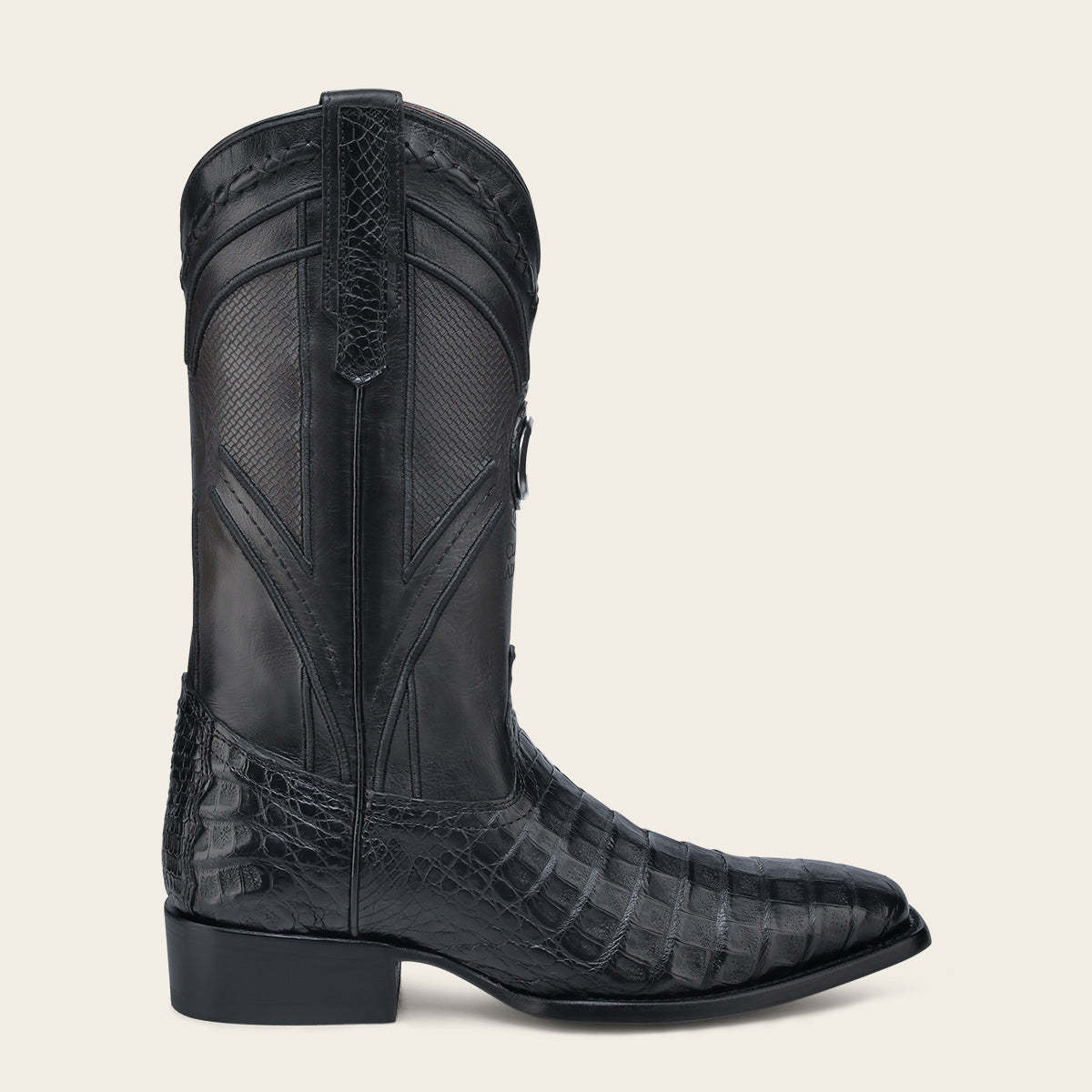 Bota vaquera para caballero en piel genuina de fuscus y piel de bovino. El tubo presenta detalles de bordado en alto relieve, tejido, y contraste de texturas. La parte frontal cuenta con aplicación metálica del monograma Cuadra sobre una aplicación de piel de fuscus, así como grabado en piel de la marca. La orejas presentan aplicación de piel genuina de fuscus. Suela de cuero con injerto de TPU. Color negro.