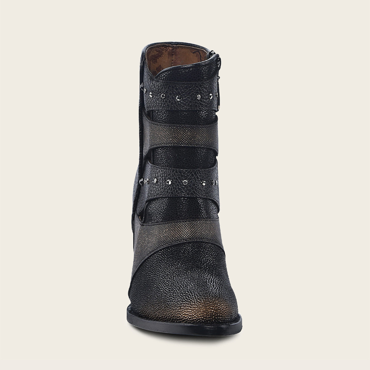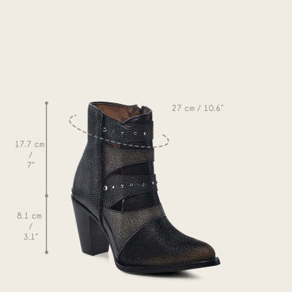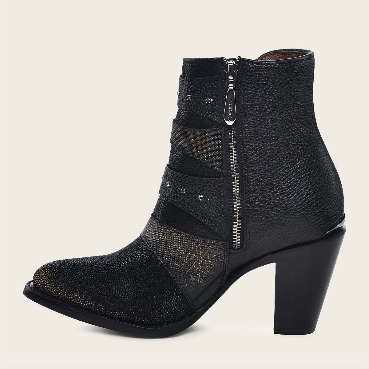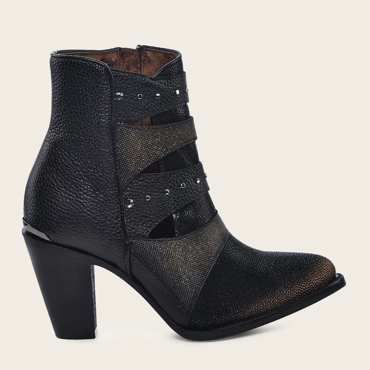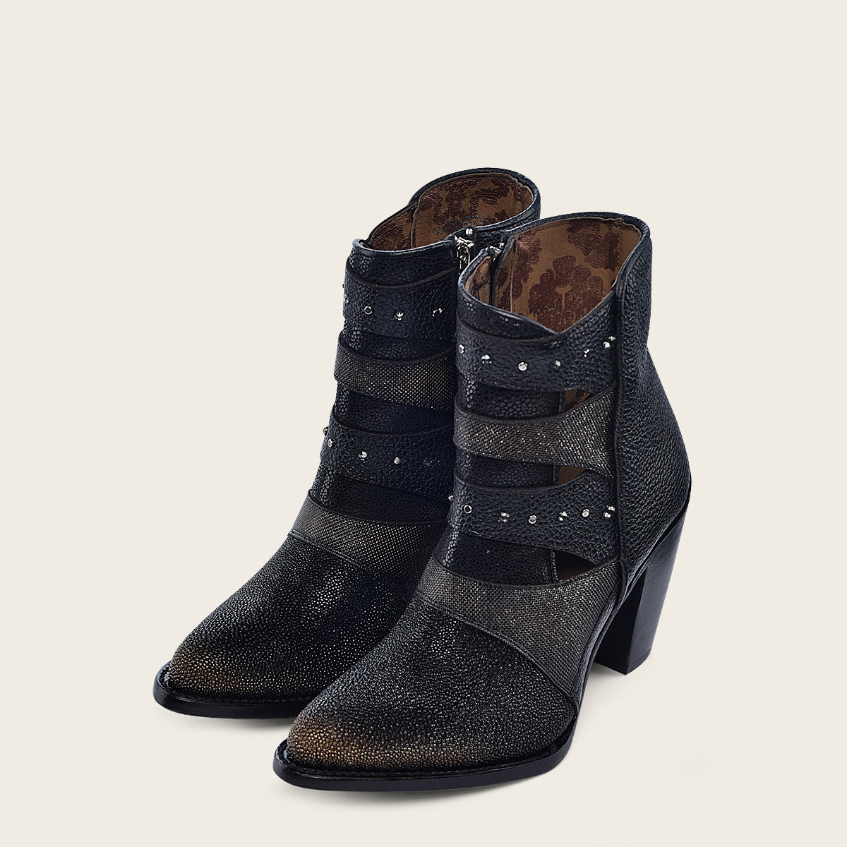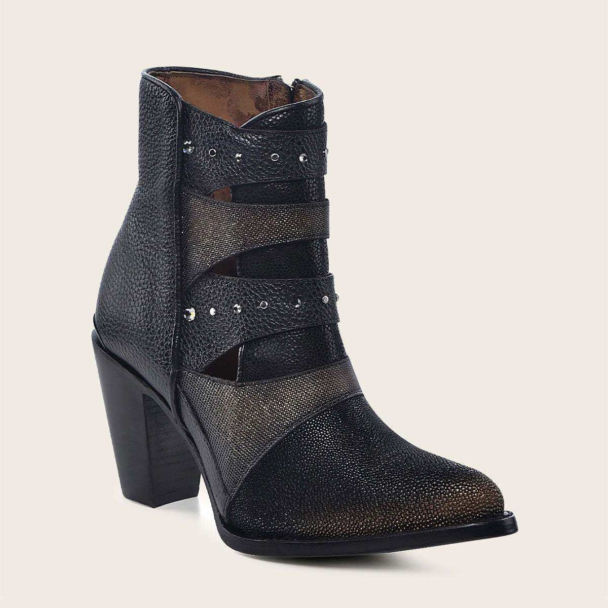 Botín para dama en piel genuina de mantarraya y piel de bovino. Ajustada por medio de cierre. Cuenta con aplicaciones frontales de estoperoles y aperturas, así como aplicación metálica en talón. Suela de cuero con TPU.
