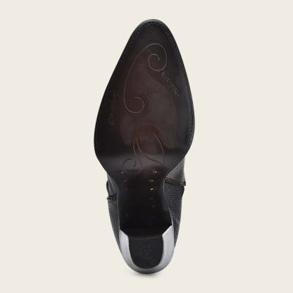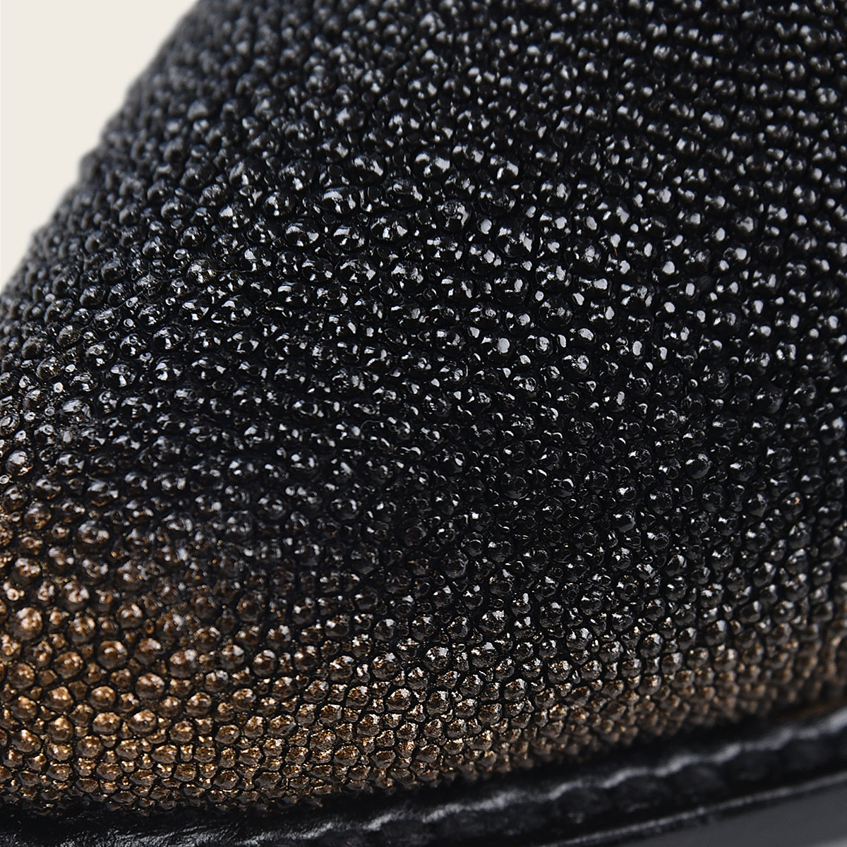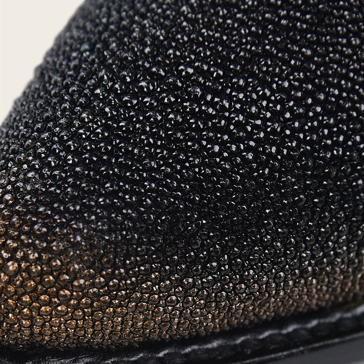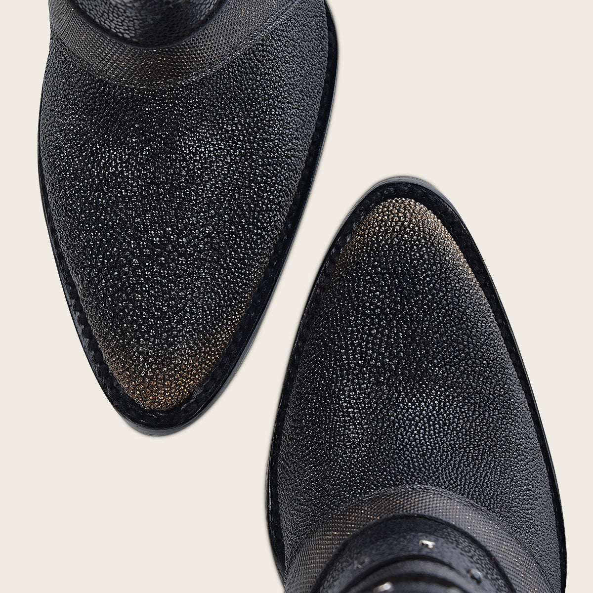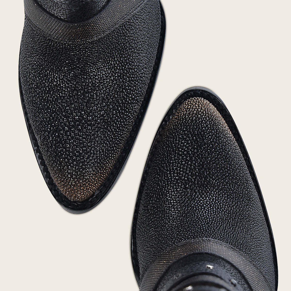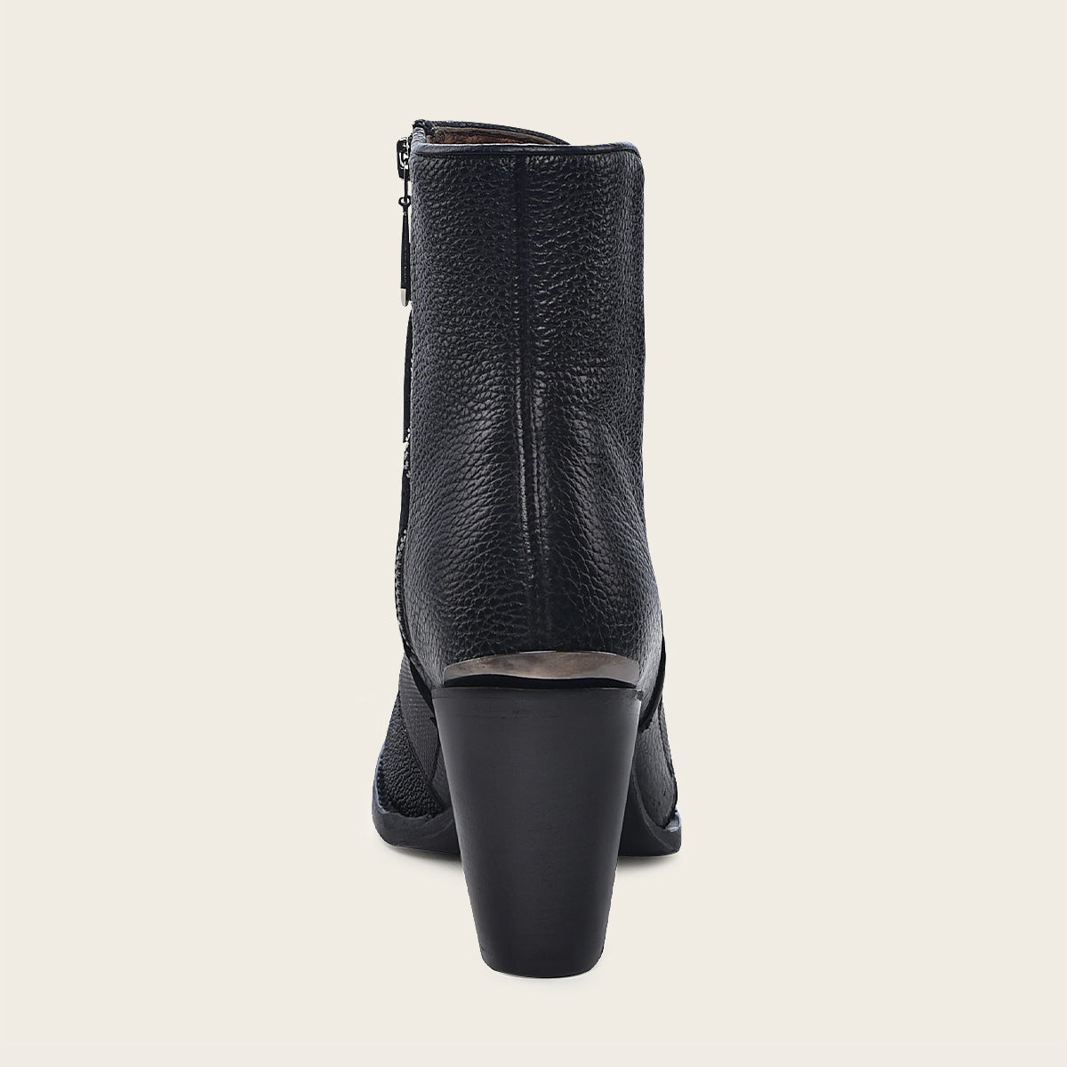 Botín para dama en piel genuina de mantarraya y piel de bovino. Ajustada por medio de cierre. Cuenta con aplicaciones frontales de estoperoles y aperturas, así como aplicación metálica en talón. Suela de cuero con TPU.