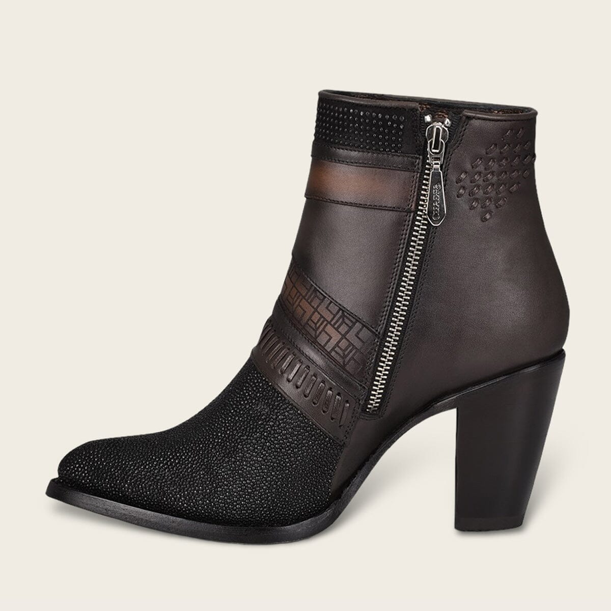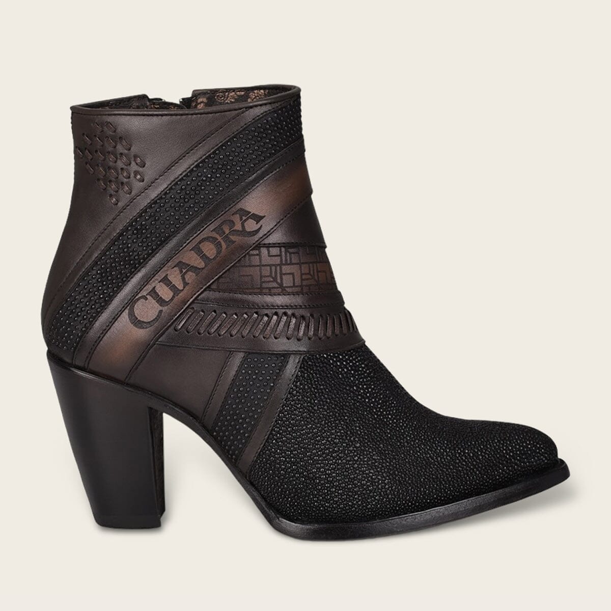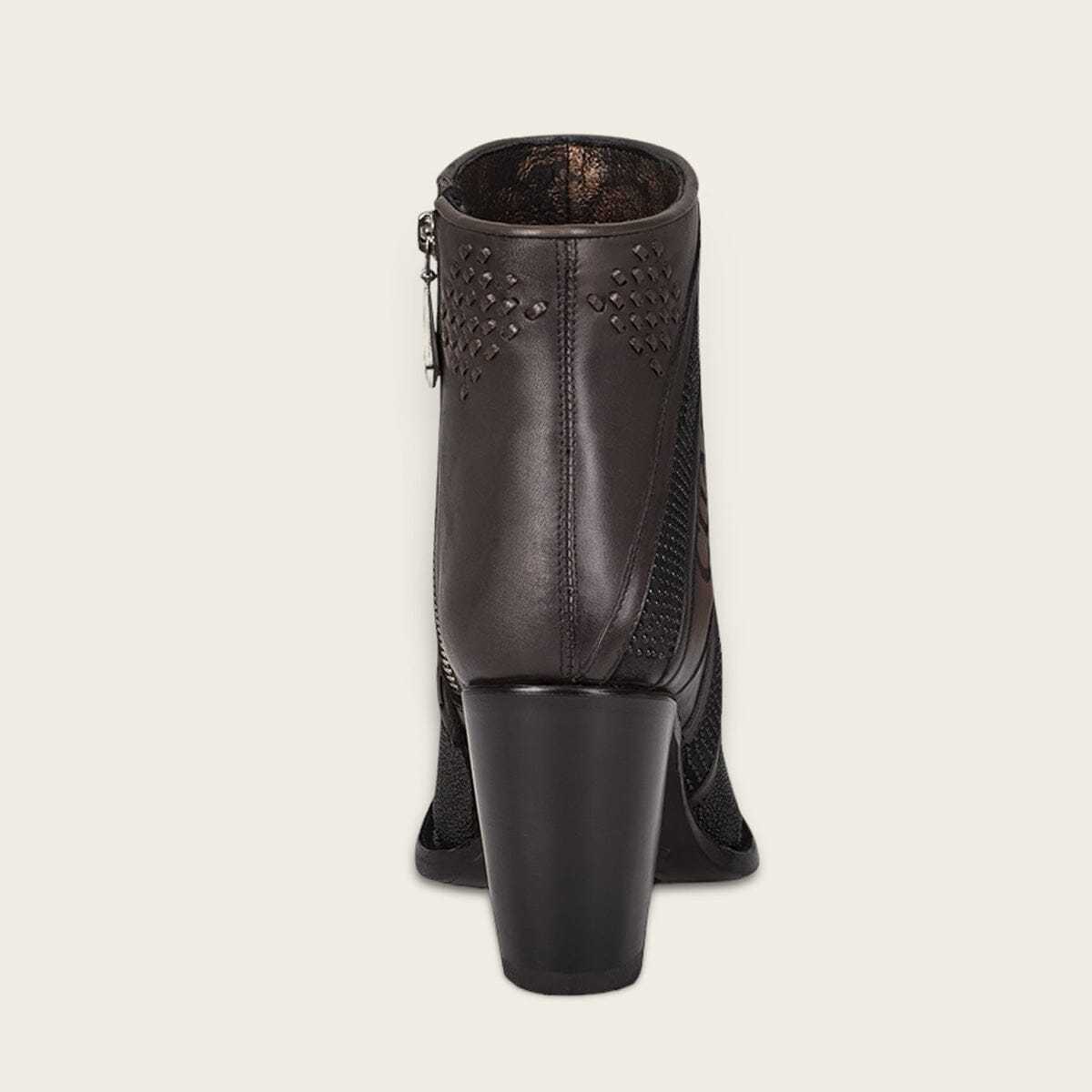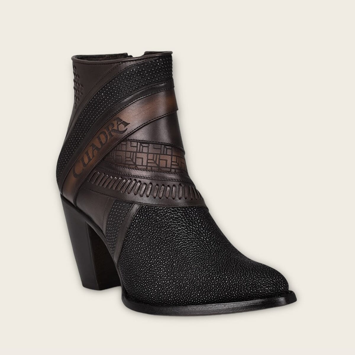 Botín para dama en piel genuina de mantarraya y piel de bovino. Presenta detalles de tejido artesanal, grabado de logotipo Cuadra y motivos geométricos. Con aplicaciones metálicas y cierre interno. Suela de cuero con injerto de TPU.