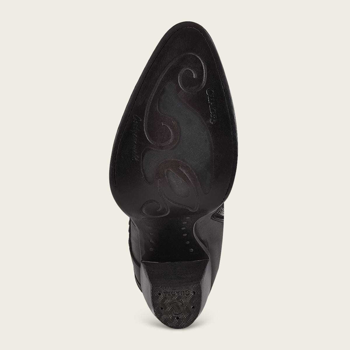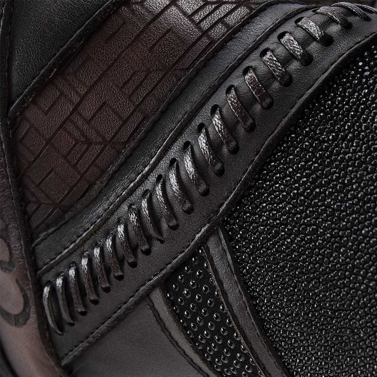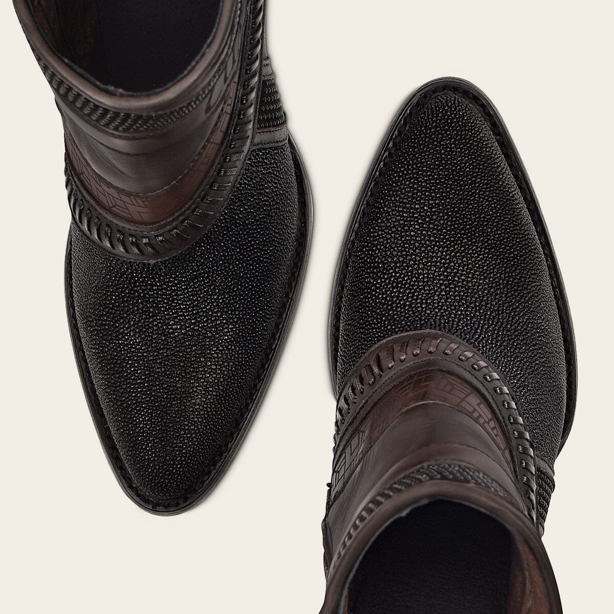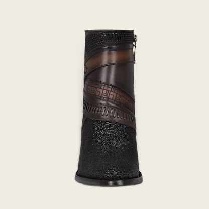 Botín para dama en piel genuina de mantarraya y piel de bovino. Presenta detalles de tejido artesanal, grabado de logotipo Cuadra y motivos geométricos. Con aplicaciones metálicas y cierre interno. Suela de cuero con injerto de TPU.