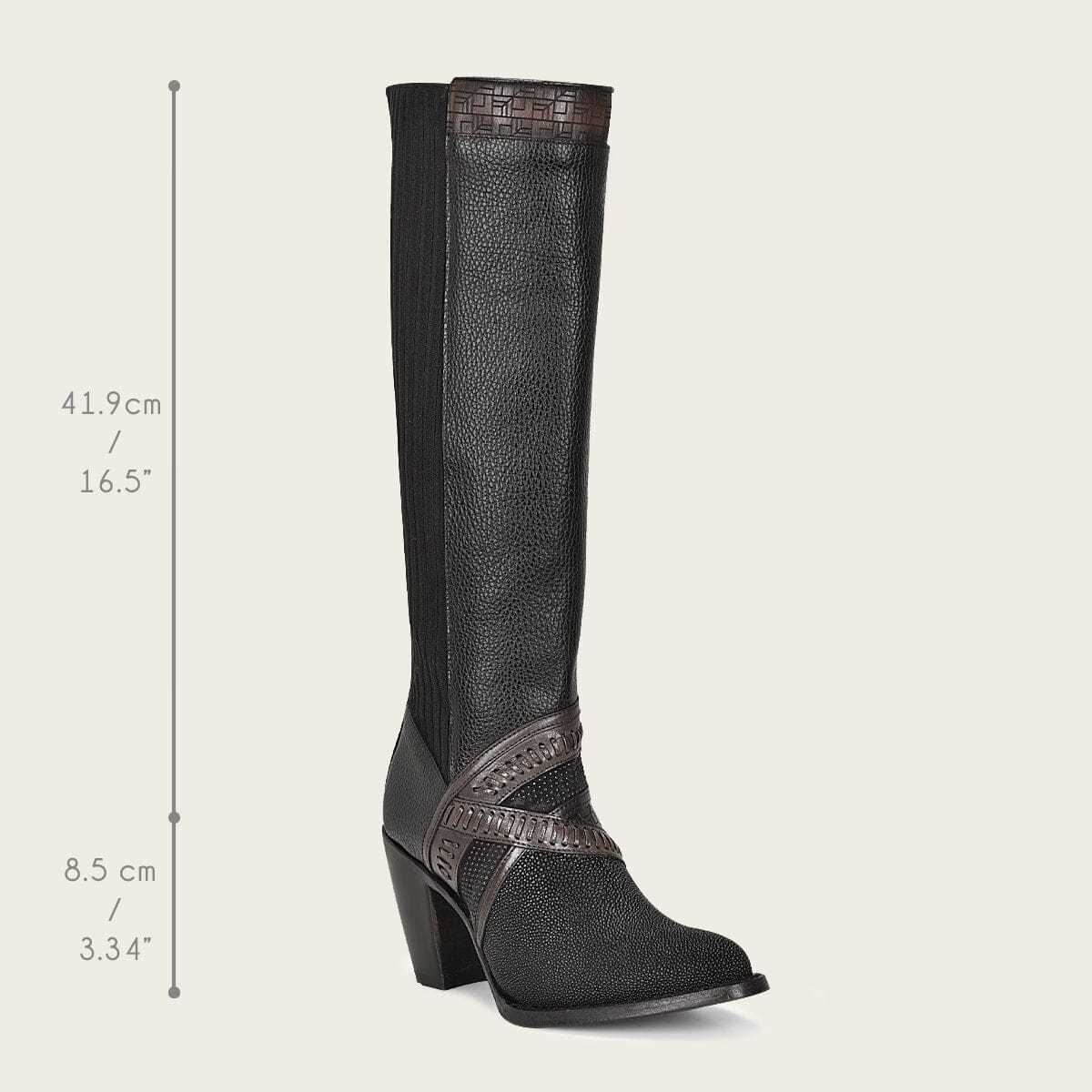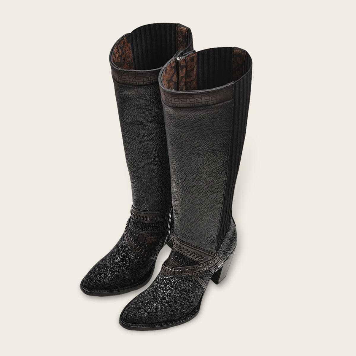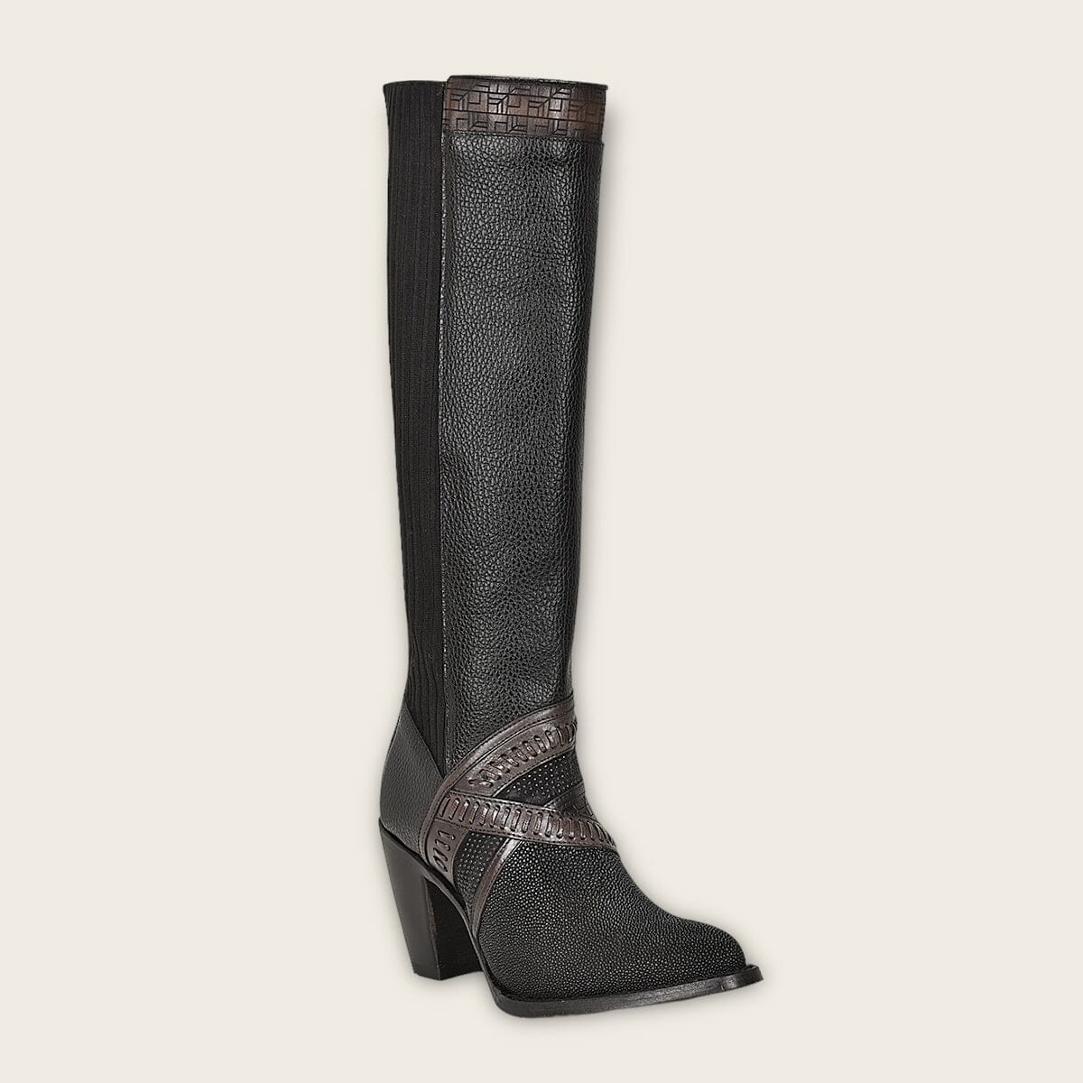 Bota alta para dama en piel genuina de mantarraya y piel de bovino. Presenta grabado láser, bordado y detalles de tejido artesanal. Ajustada con cierre interno y aplicación textil elástica en la parte trasera. Con suela con injerto de TPU.Las marcas y cicatrices que puede presentar lejos de ser considerados como defecto demuestran autenticidad de cada producto.