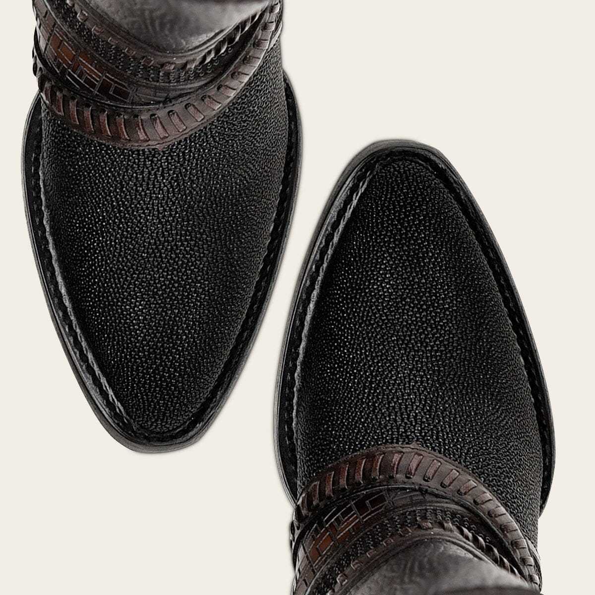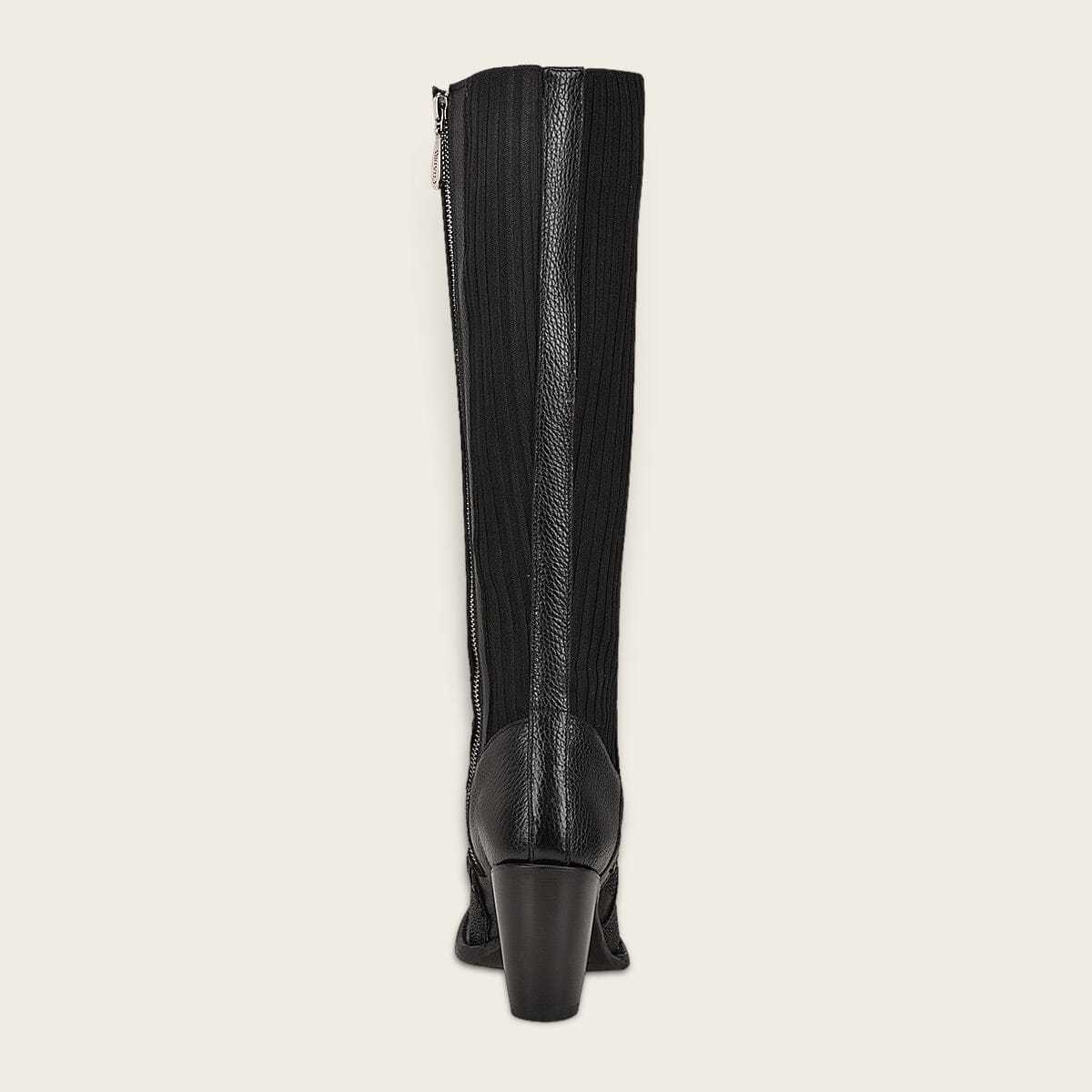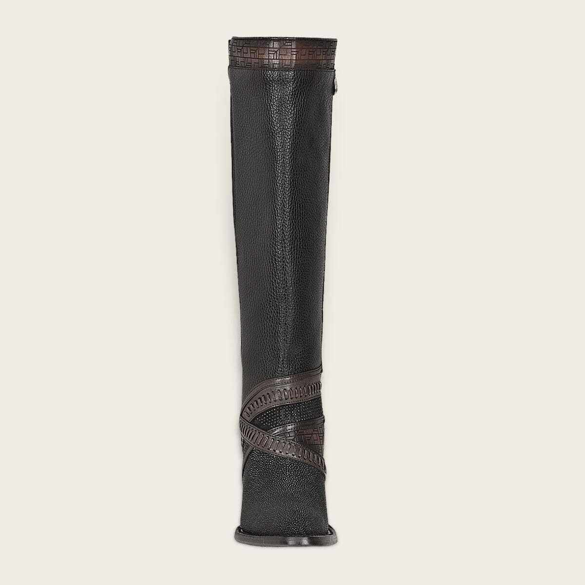 Bota alta para dama en piel genuina de mantarraya y piel de bovino. Presenta grabado láser, bordado y detalles de tejido artesanal. Ajustada con cierre interno y aplicación textil elástica en la parte trasera. Con suela con injerto de TPU.Las marcas y cicatrices que puede presentar lejos de ser considerados como defecto demuestran autenticidad de cada producto.