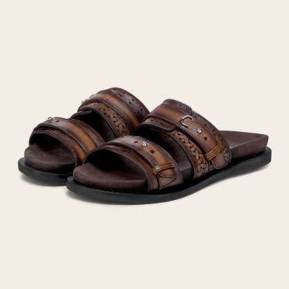 Sandalia para dama en piel genuina de bovino. Presenta ajuste de doble correa, grabado y perforado láser, aplicación del monograma Franco Cuadra y estoperoles.