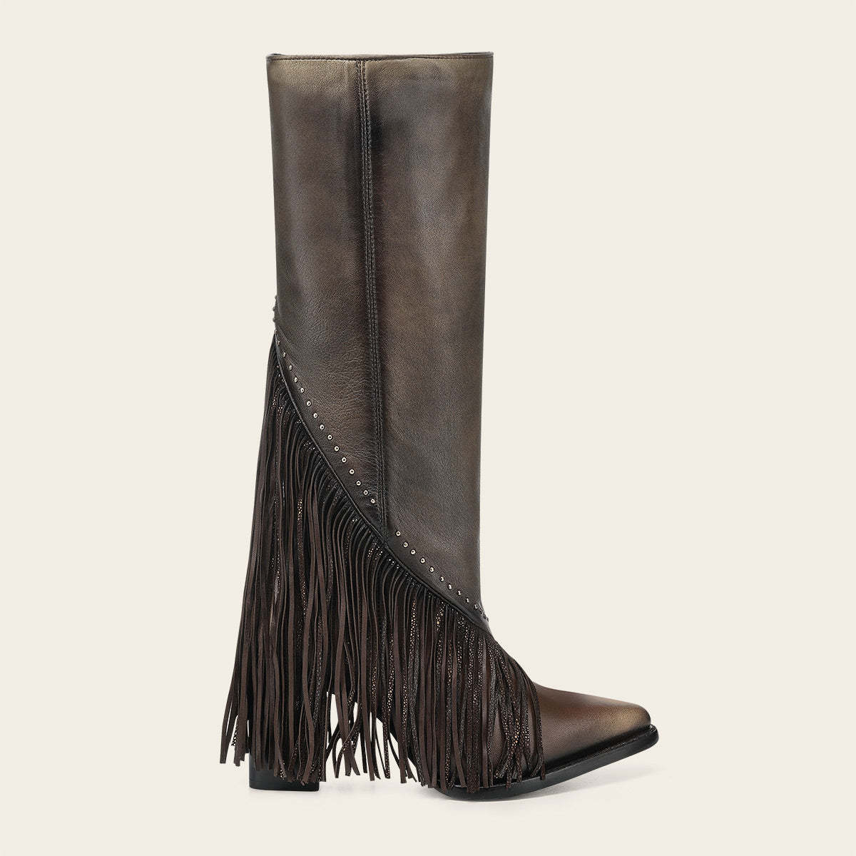 Bota alta para dama en piel genuina de bovino. Presenta aplicación de flecos con sutil estampado, estoperoles y acabado pintado a mano. Ajustada con cierre interno. Cuenta con las nuevas tecnologías: platilla flex removible, planta Ortholite, que le dan mayor ligereza, confort, transpirabilidad y amortiguación y un tubo suave diseñado con entretelas. Con suela de cuero con injerto de TPU.