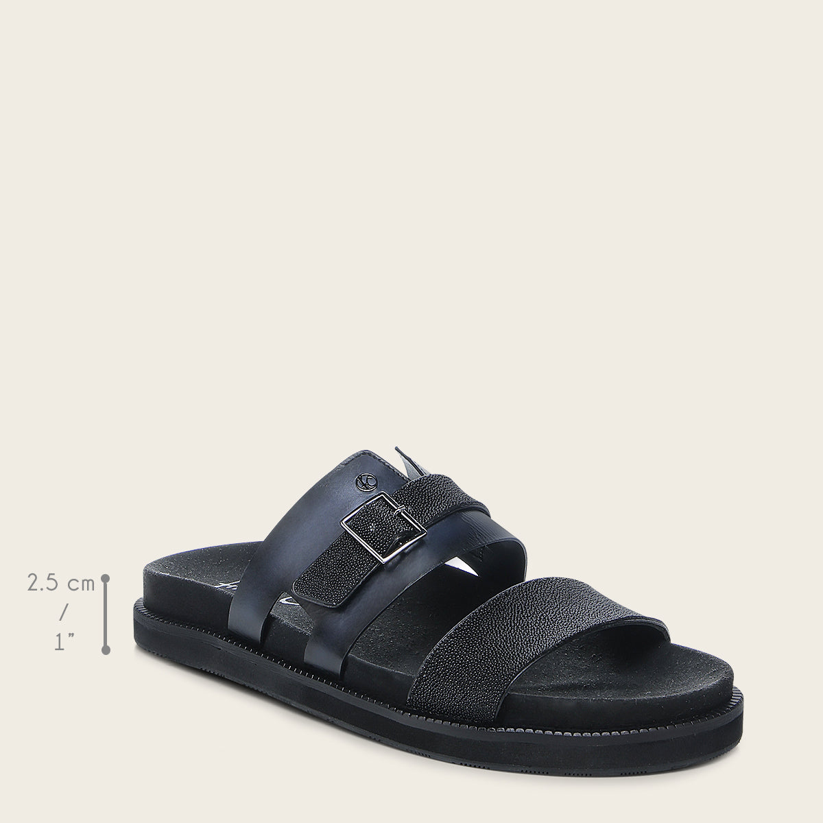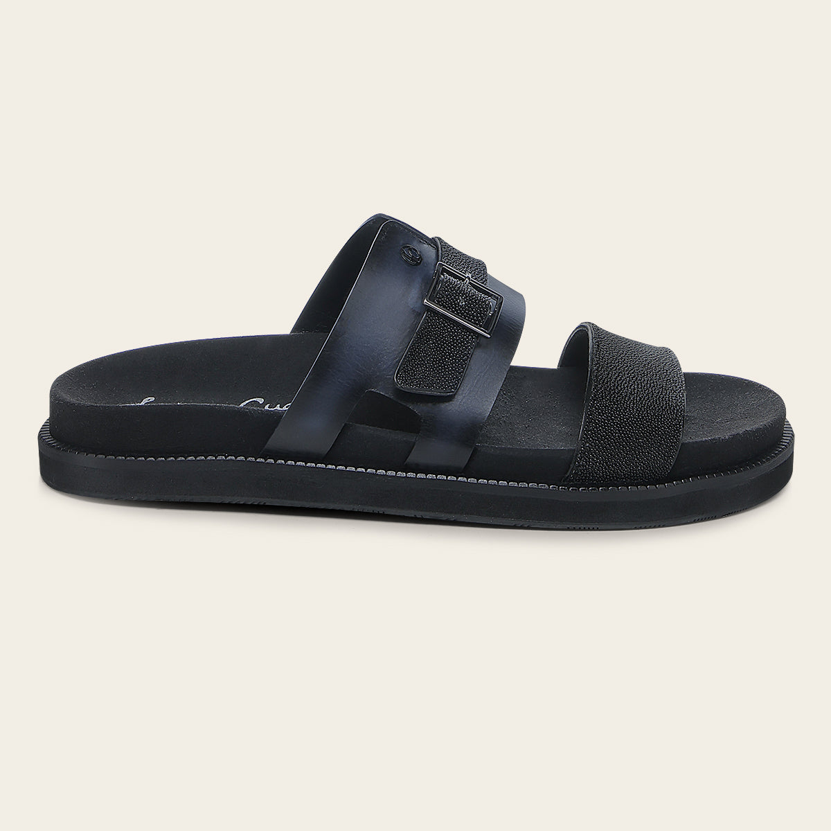 Sandalia para caballero en piel genuina de mantarraya y piel de bovino. Presenta acabado vintage , hebilla metálica decorativa, contraste de colores, sombreado a mano y aplicación metálica del monograma Franco Cuadra. Con plantilla anatómica para mejor amortiguación y suela de EVA.