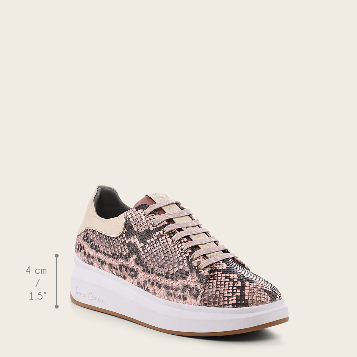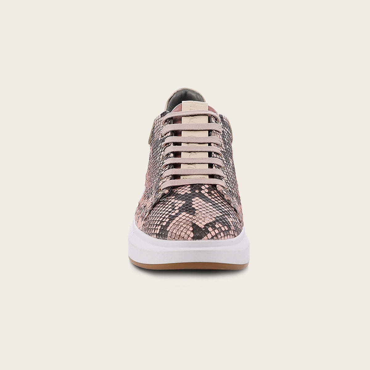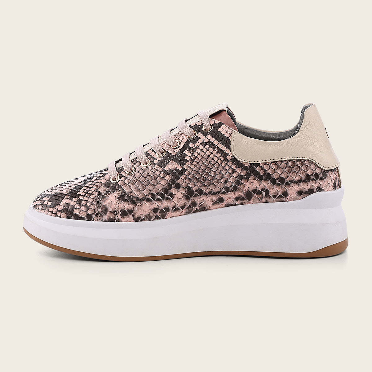 Tenis para dama en piel genuina de pitón. Con contraste de texturas en la parte superior. Ajuste por medio de agujetas. Suela de cuero con TPU.
