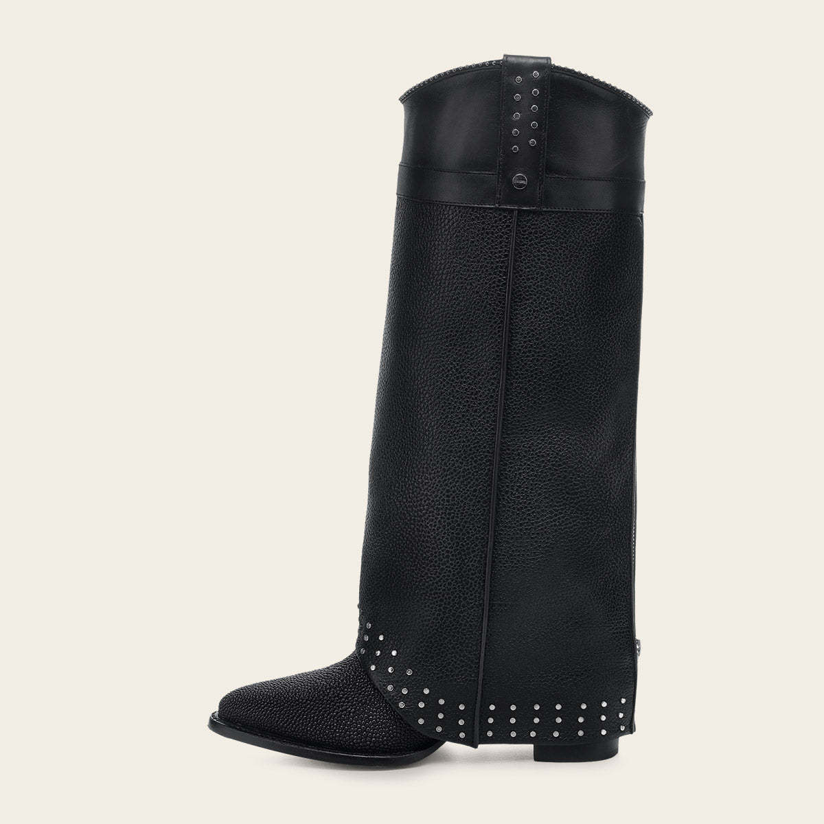 Bota western fashion plegable para dama en piel genuina de mantarraya y piel de bovino. Presenta correa decorativa, estoperoles y aplicación metálica con el logotipo de Cuadra en los costados. Suela de cuero con injerto de TPU.