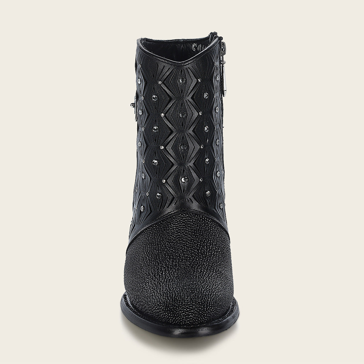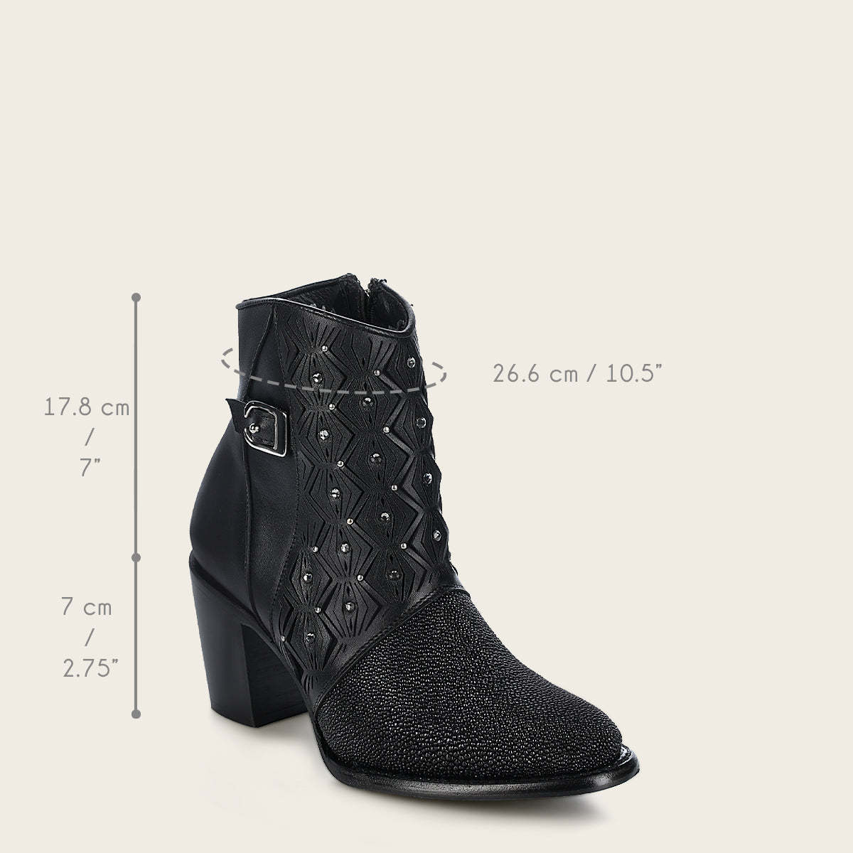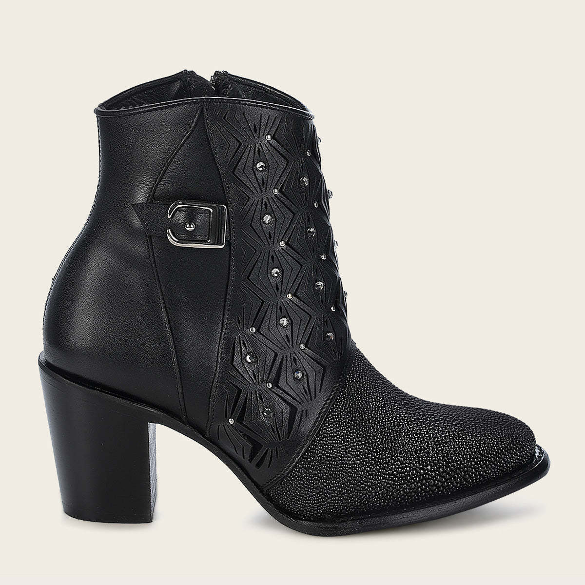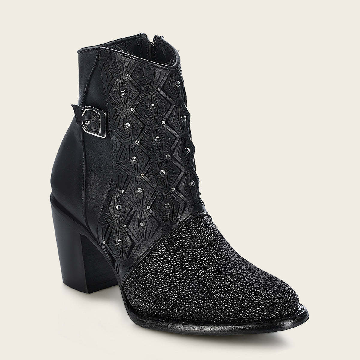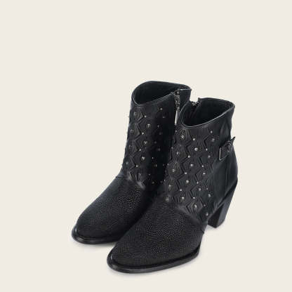 Botín para dama en piel genuina de mantarraya. Presenta perforaciones en piel con motivos geométricos y aplicaciones de cristales auténticos. Cuenta con hebilla decorativa en el costado. Ajuste mediante cierre interno. Suela de cuero con injerto de TPU.