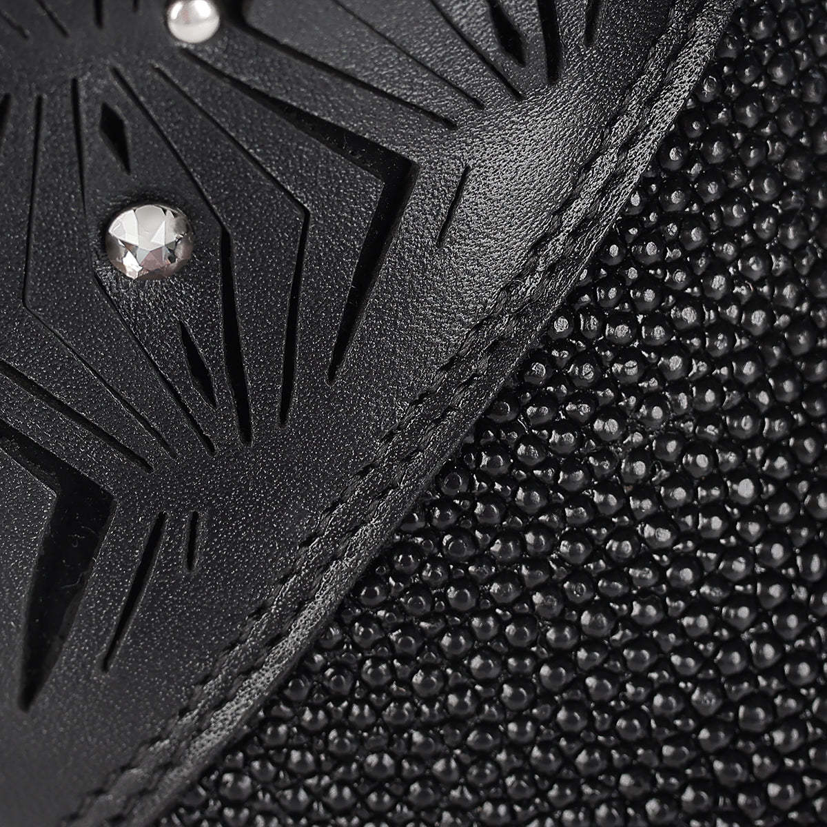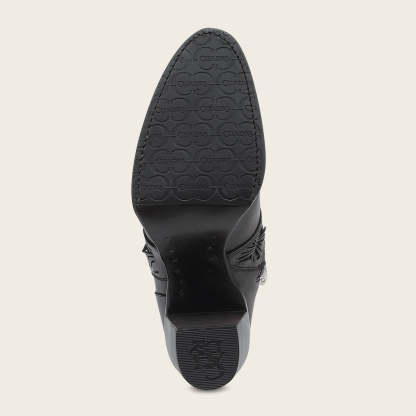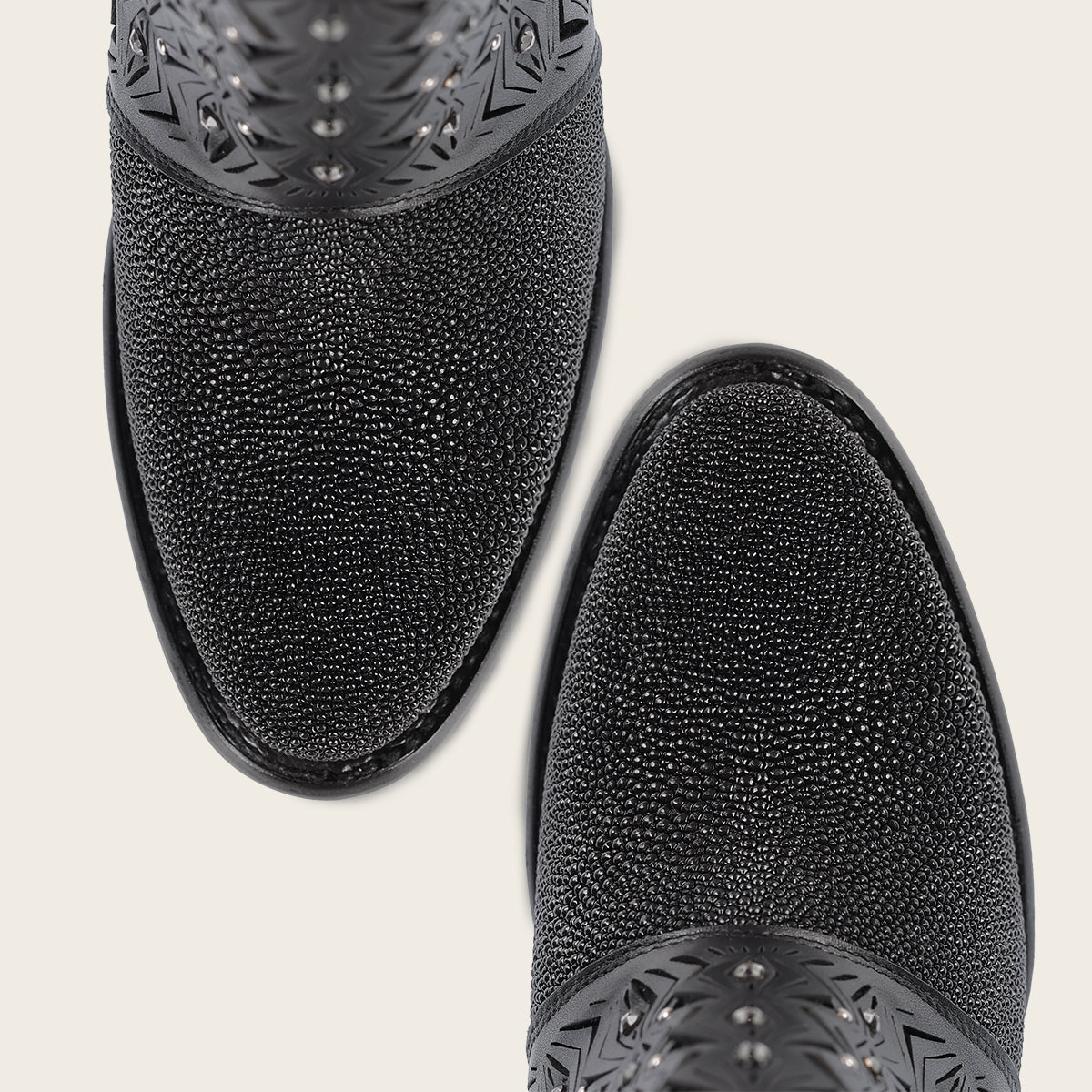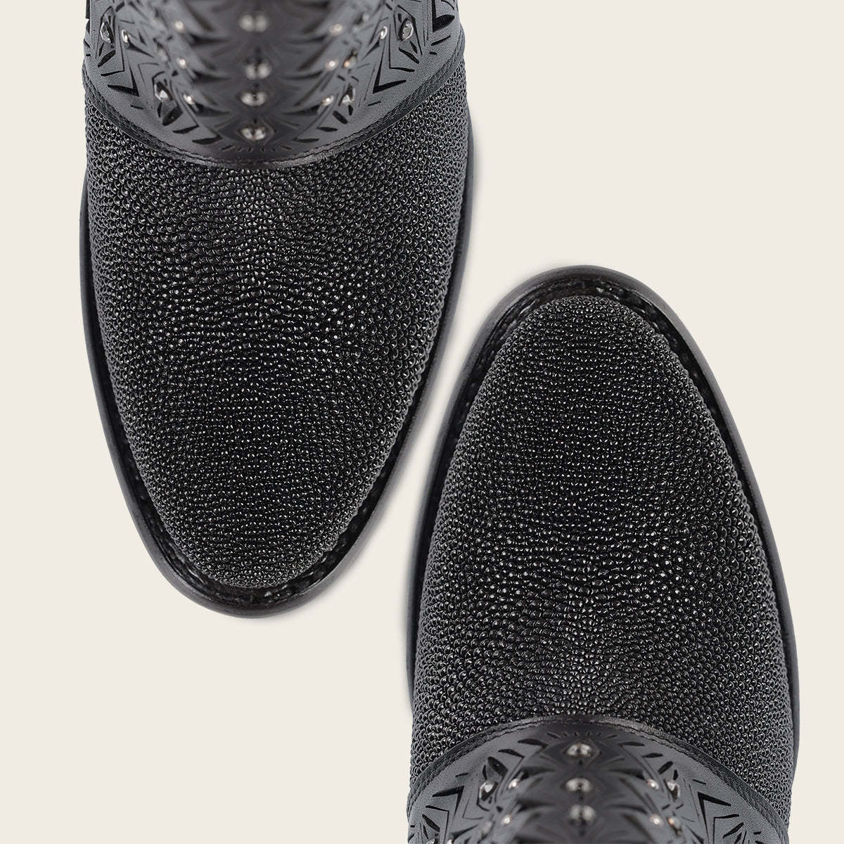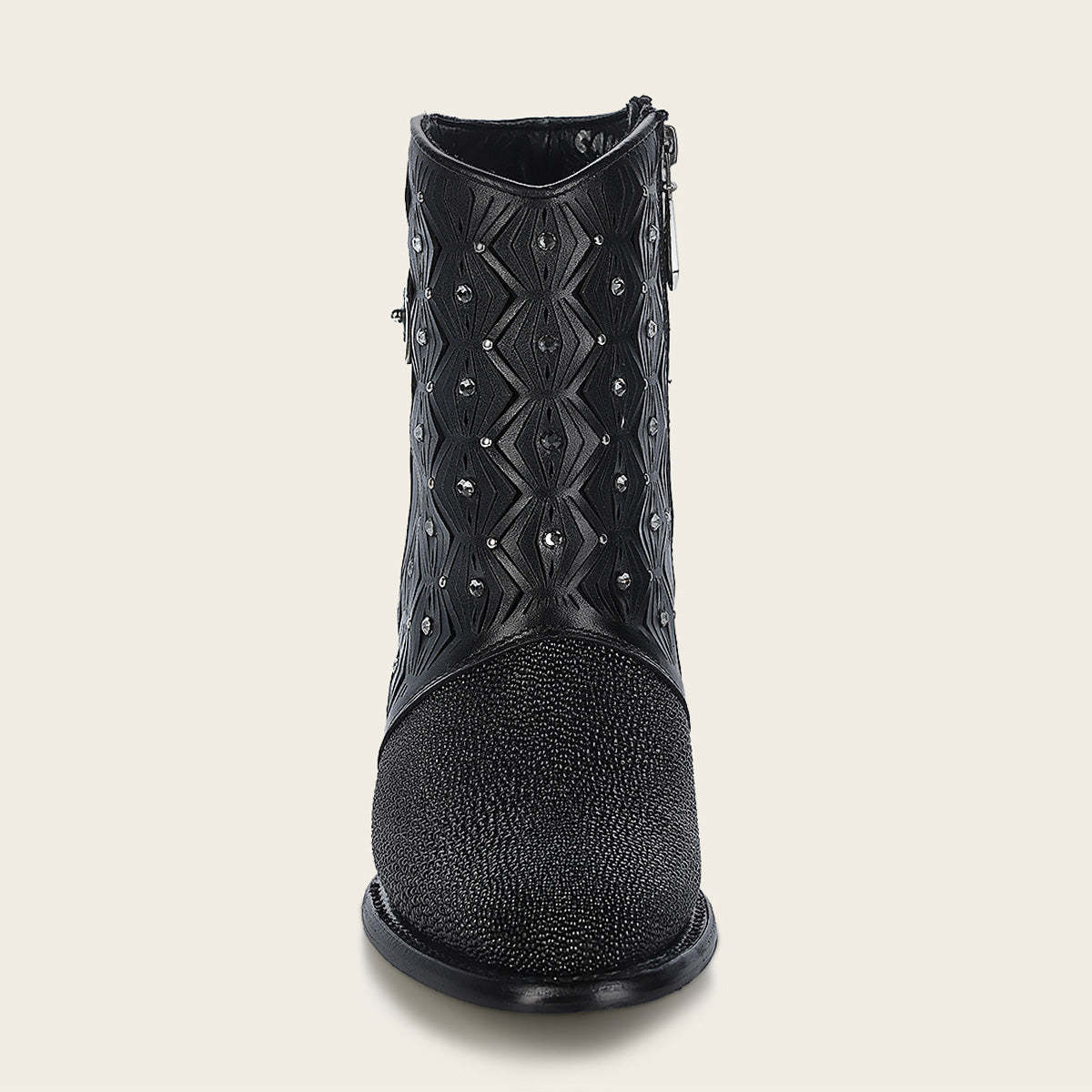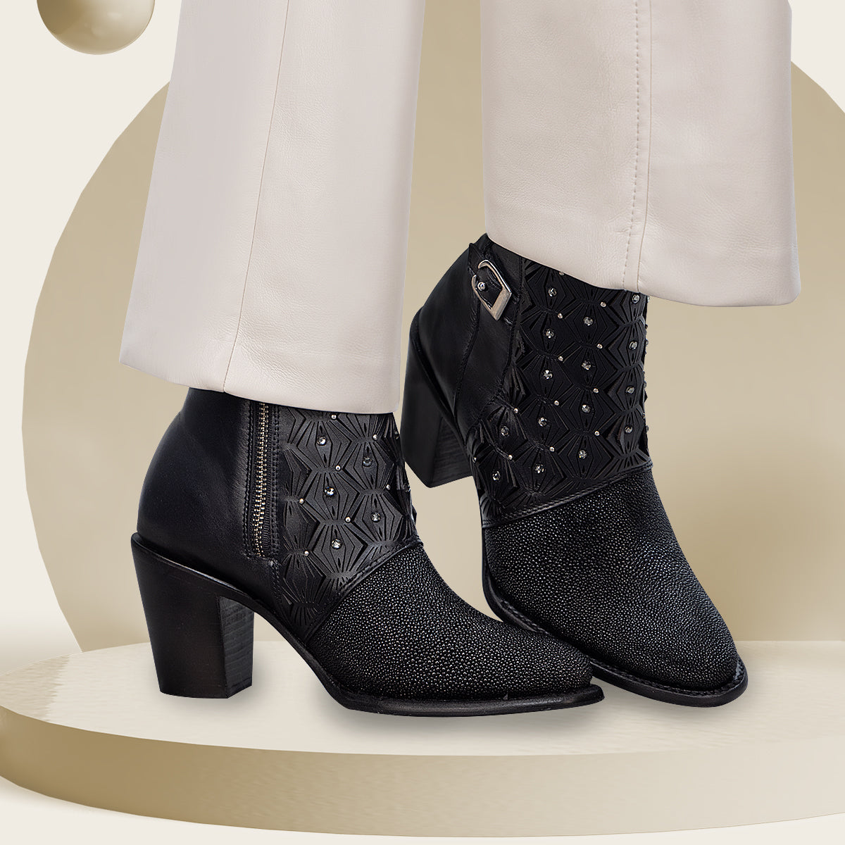 Botín para dama en piel genuina de mantarraya. Presenta perforaciones en piel con motivos geométricos y aplicaciones de cristales auténticos. Cuenta con hebilla decorativa en el costado. Ajuste mediante cierre interno. Suela de cuero con injerto de TPU.