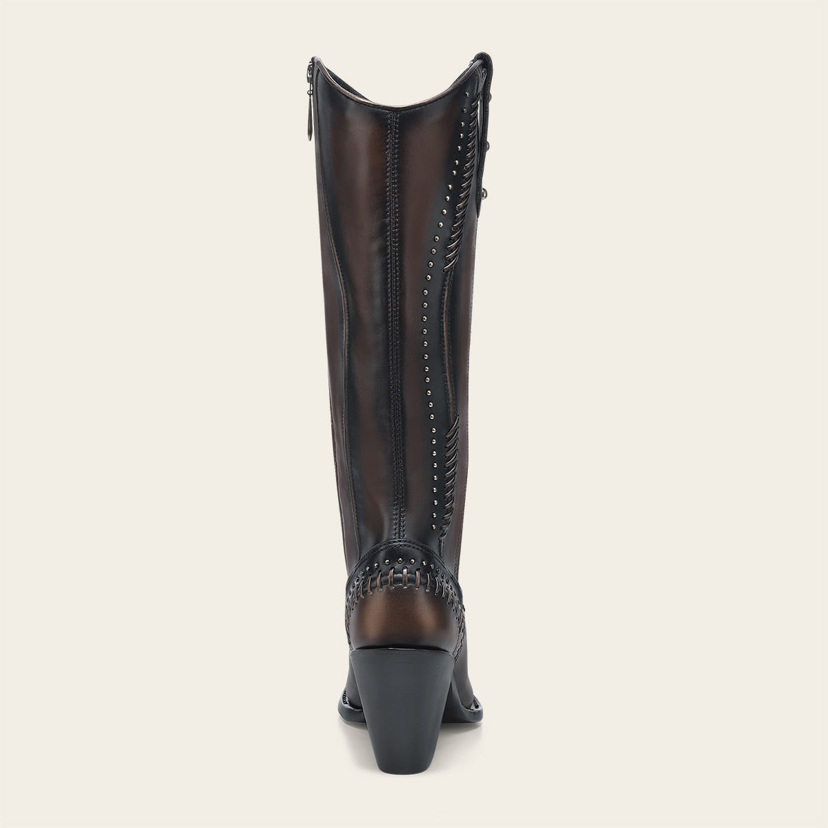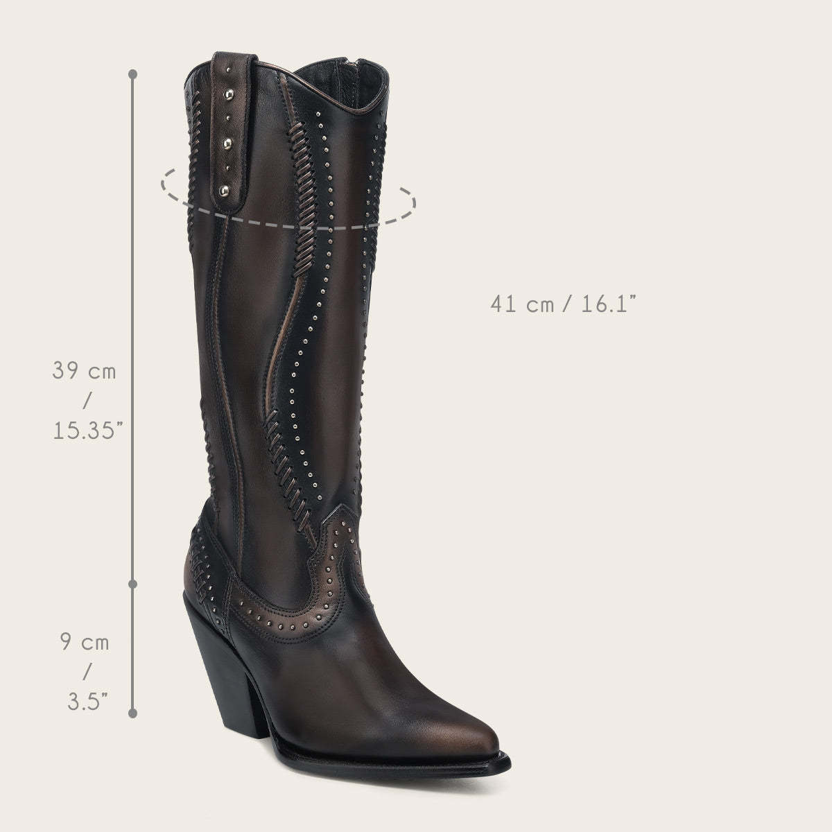 Bota alta para dama en piel genuina de bovino. Presenta acabado vintage pintado a mano, tejido artesanal y finos herrajes metálicos. Con oreja al costado decorada con aplicaciones metálicas. Ajustada con cierre interno. Cuenta con las nuevas tecnologías: platilla flex removible, planta Ortholite, que le dan mayor ligereza, confort, transpirabilidad y amortiguación y un tubo suave diseñado con entretelas. Con suela de cuero con injerto de TPU.