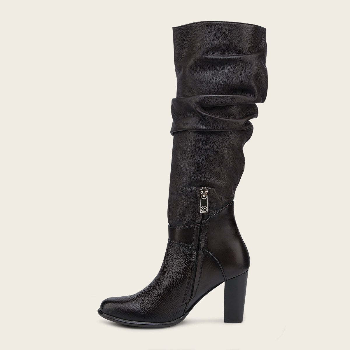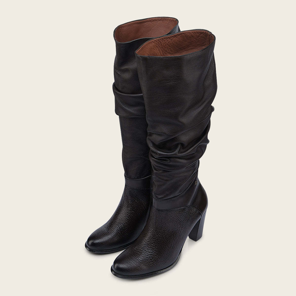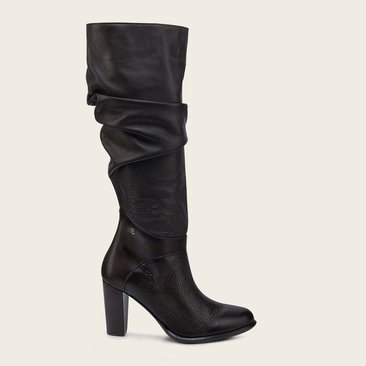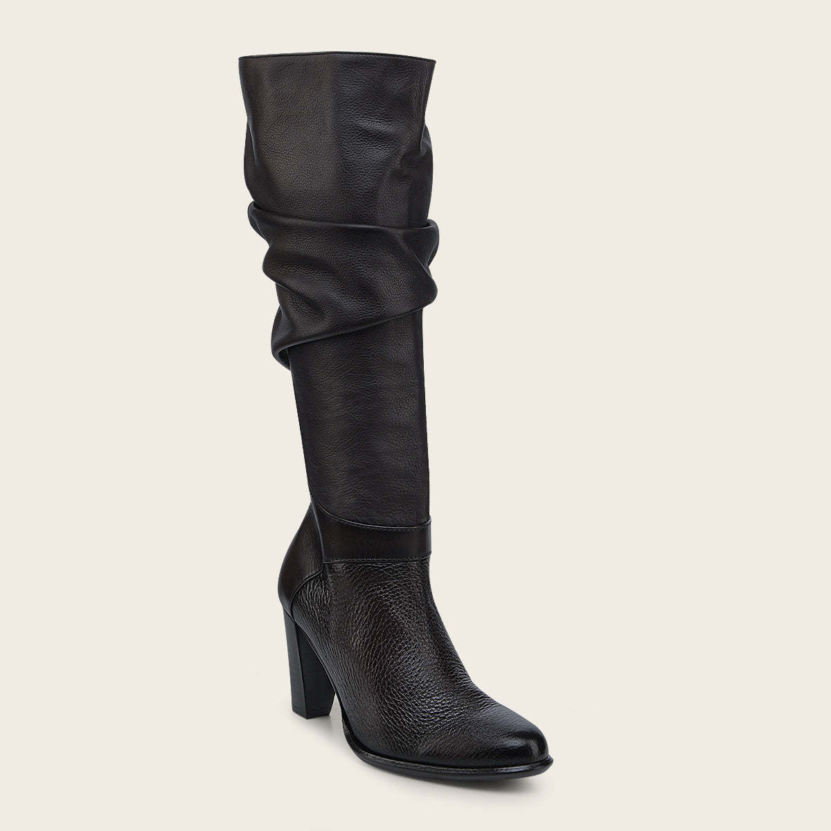 Bota para dama en piel genuina de venado y bovino. Presenta contraste de texturas, el tubo con acabado corrugado. Suela de cuero con TPU.