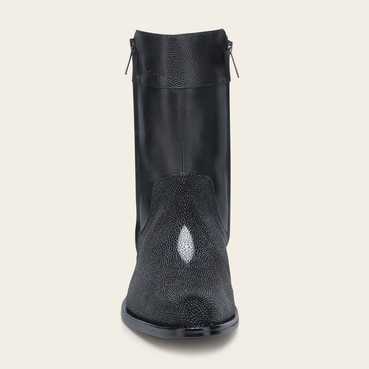 Bota de vestir para caballero en piel genuina de mantarraya y piel de bovino. Presenta grabado del logotipo Franco Cuadra y sombreado a mano. Ajustado con doble cierre a los costados. Con suela de cuero con injerto de TPU.