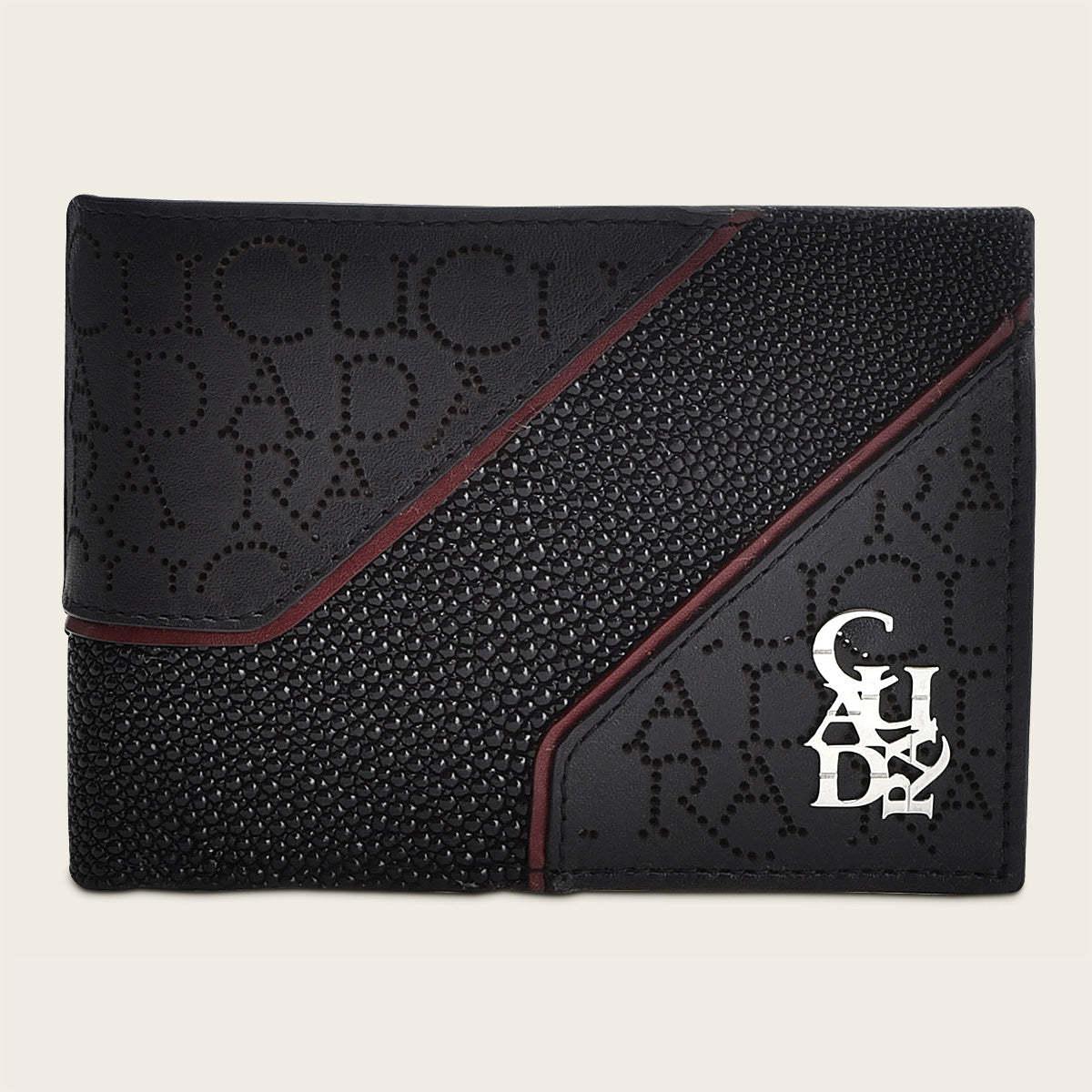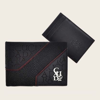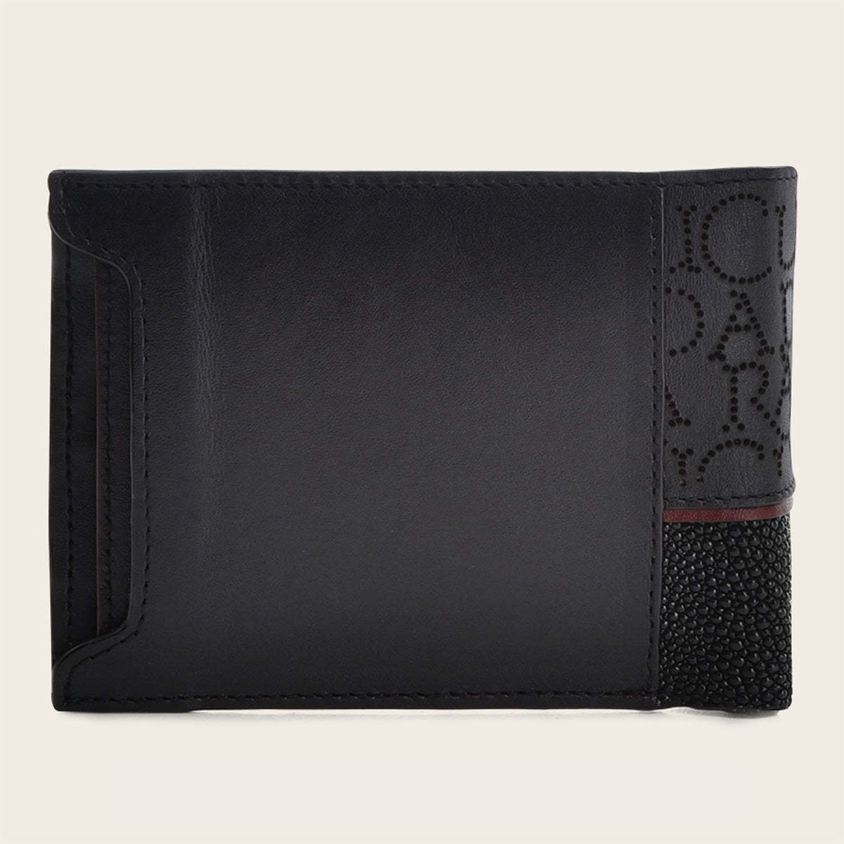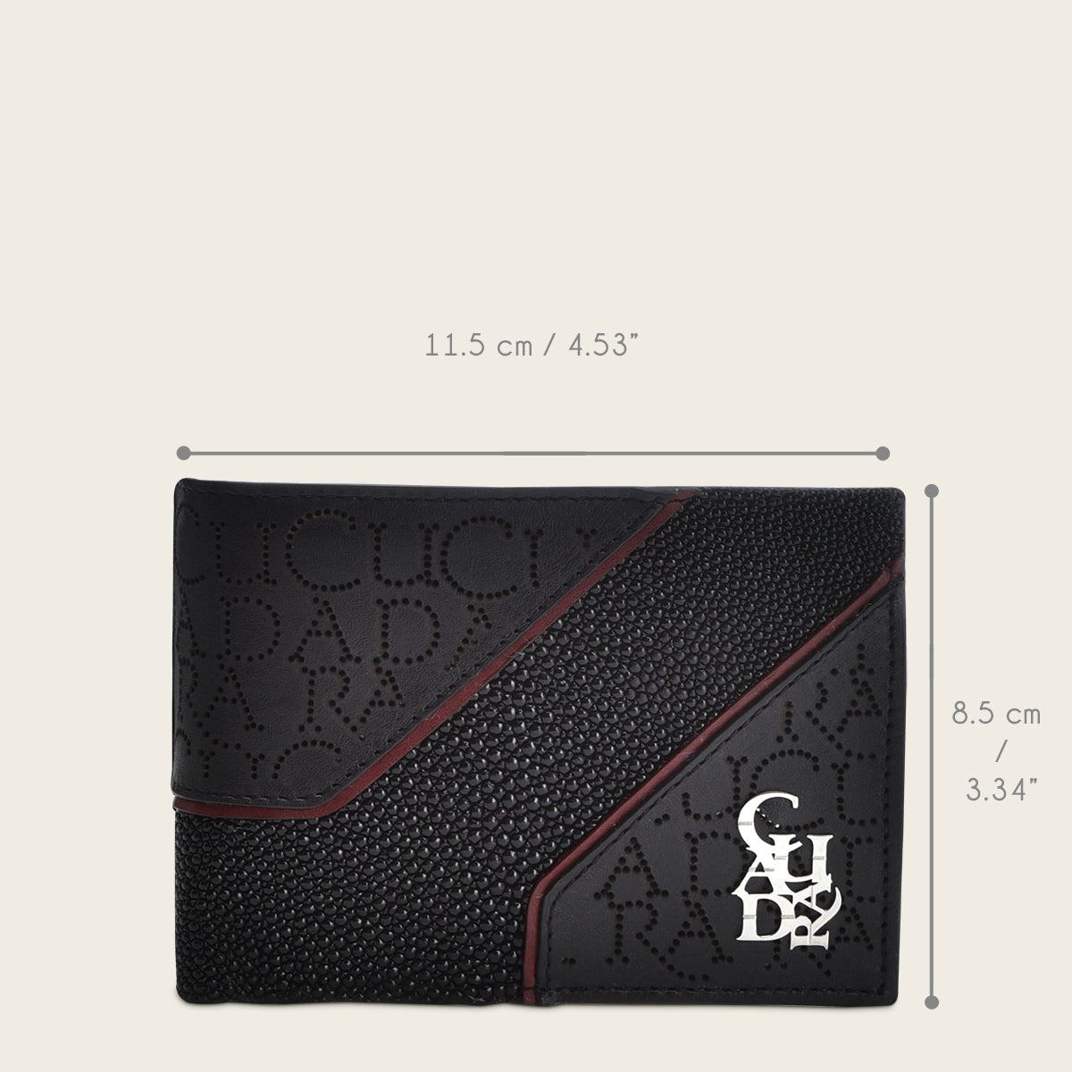 Cartera para caballero en piel genuina de mantarraya . Al frente con ligero contraste de color, fino perforado con logo de la marca. Herraje metálico con logo de la marca. En la parte trasera cuenta con tarjetero externo en piel de bovino con espacio para cinco tarjetas. La parte interna cuenta con cinco espacios para tarjetas y dos para efectivo. Color negro.