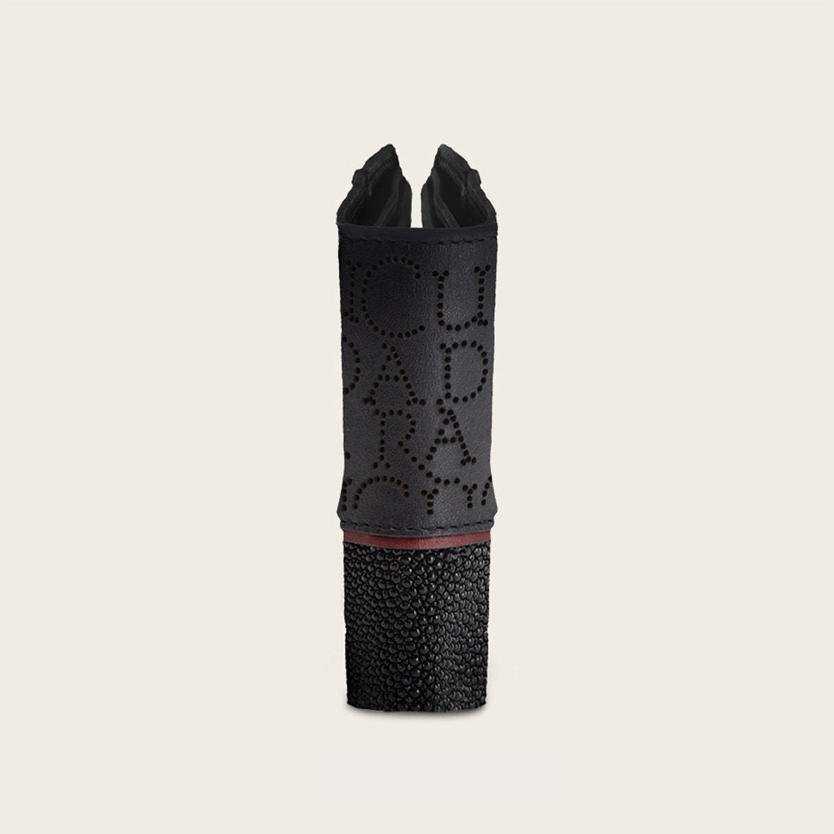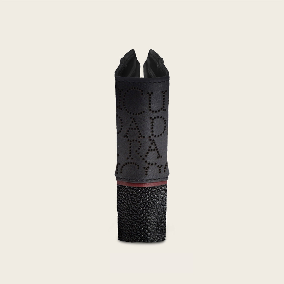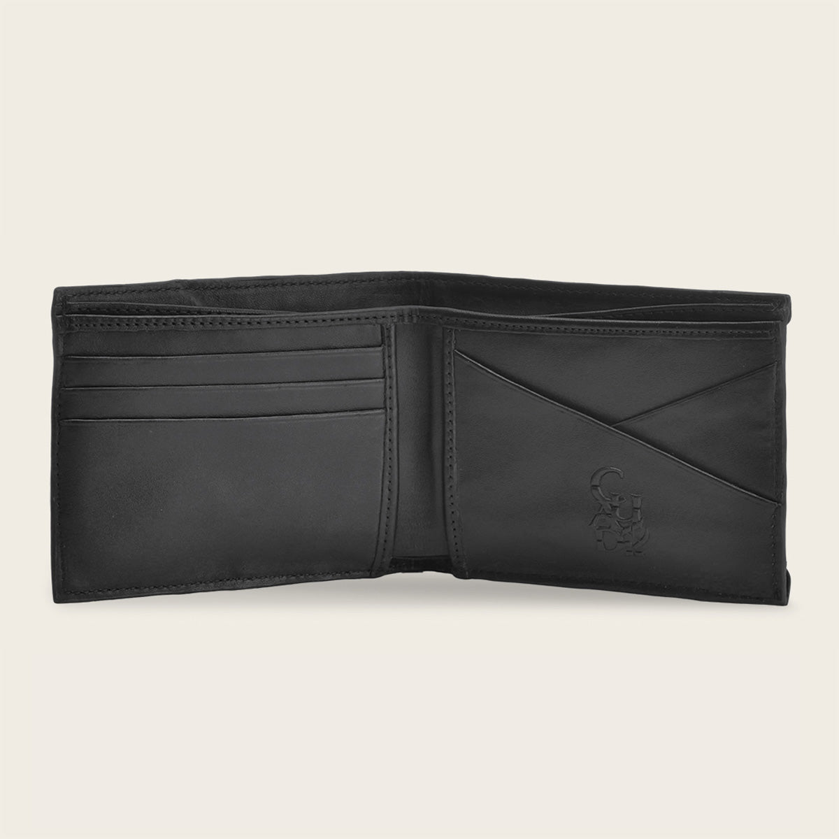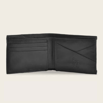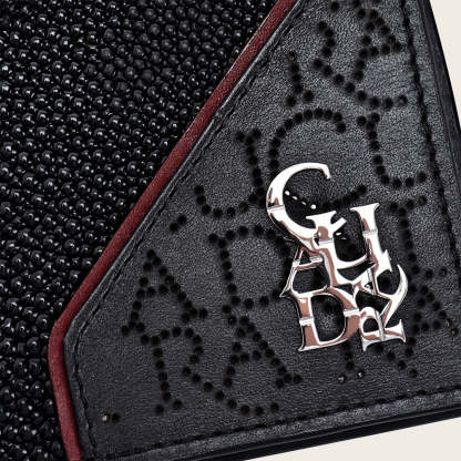 Cartera para caballero en piel genuina de mantarraya . Al frente con ligero contraste de color, fino perforado con logo de la marca. Herraje metálico con logo de la marca. En la parte trasera cuenta con tarjetero externo en piel de bovino con espacio para cinco tarjetas. La parte interna cuenta con cinco espacios para tarjetas y dos para efectivo. Color negro.