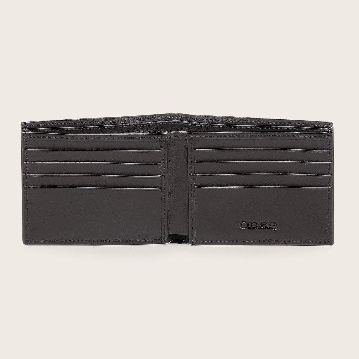 Cartera en piel genuina de venado italiano y piel de bovino para caballero. Al frente presenta tejido artesanal y aplicación metálica del logotipo Cuadra. En su interior cuenta con grabado del logotipo, ocho espacios para tarjetas y dos espacios para efectivo.