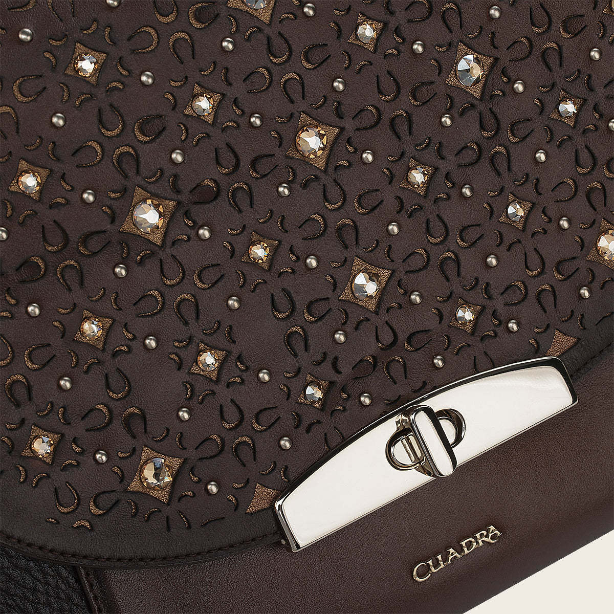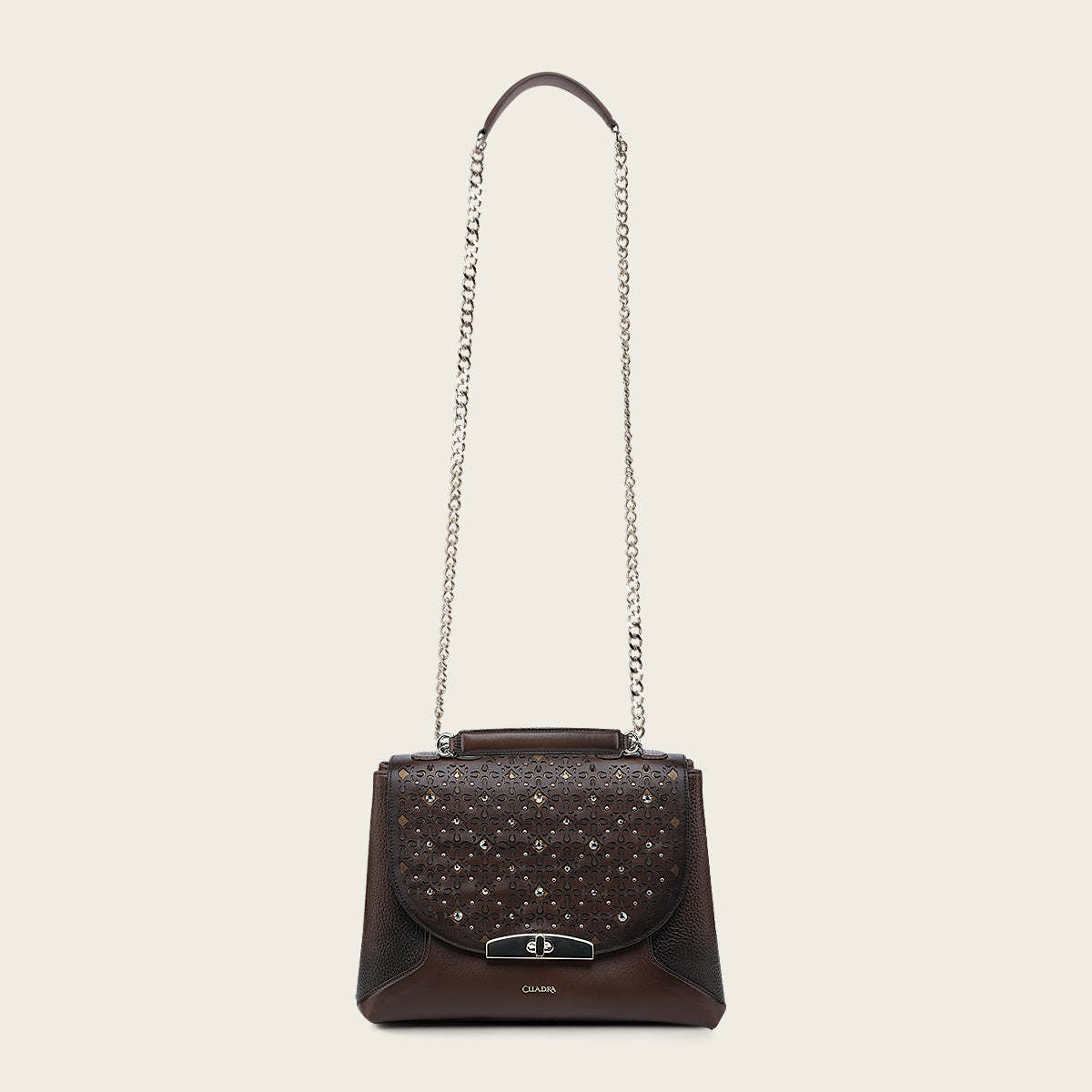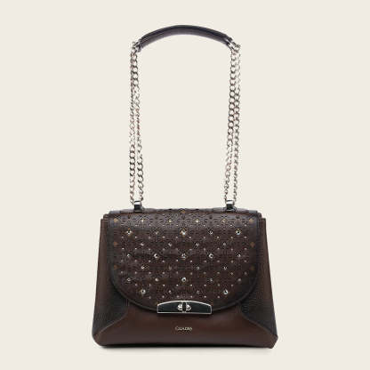 Bolso crossbody para dama en piel genuina de bovino. Presenta aplicación de cristales auténticos y detalles de brocado en motivos orgánicos, así como pequeña aplicación del logotipo Cuadra. Asegurado con broche metálico al frente e imanes. Asa de cadena y piel genuina de bovino ajustable. Cuenta con un bolsillo interno con cierre. Color miel