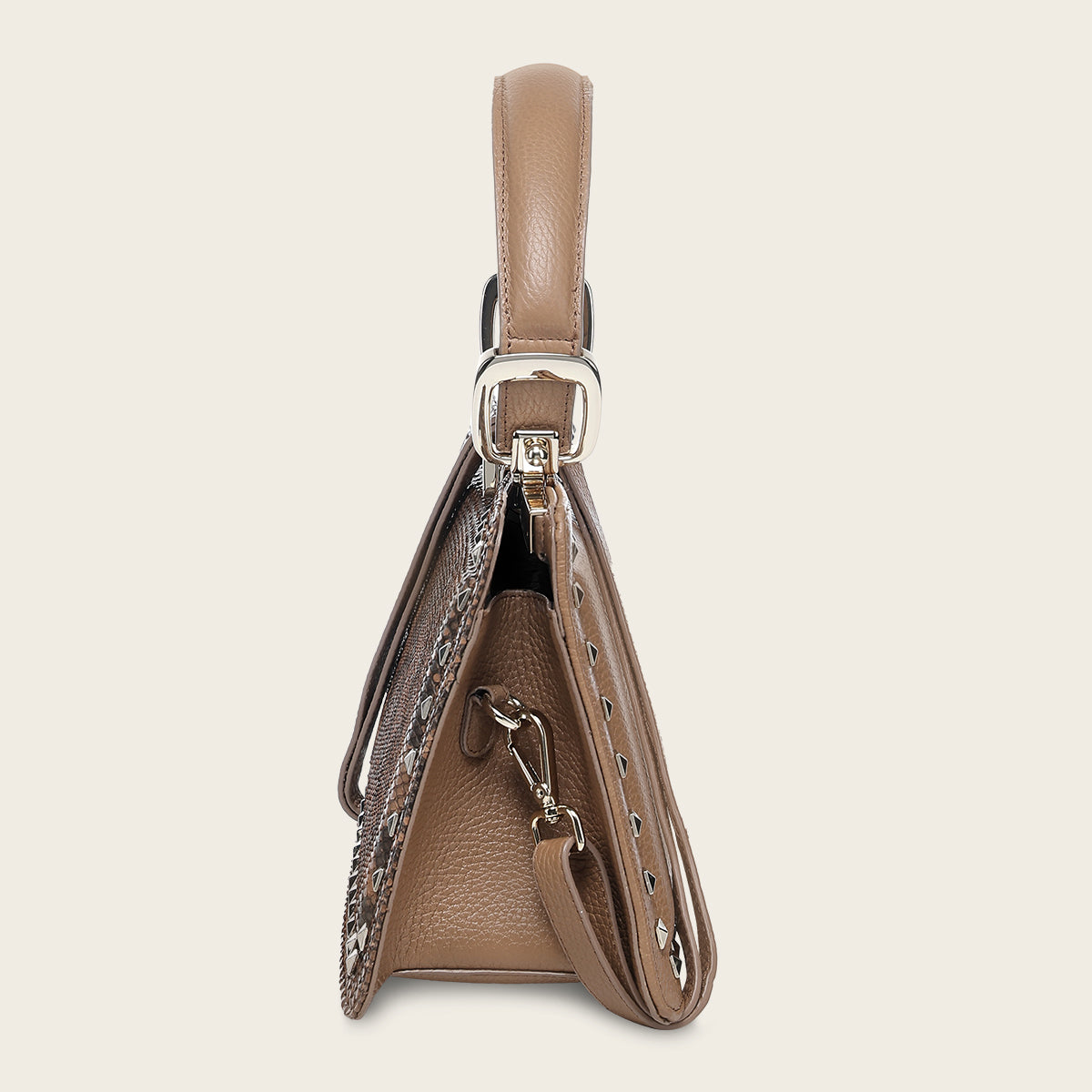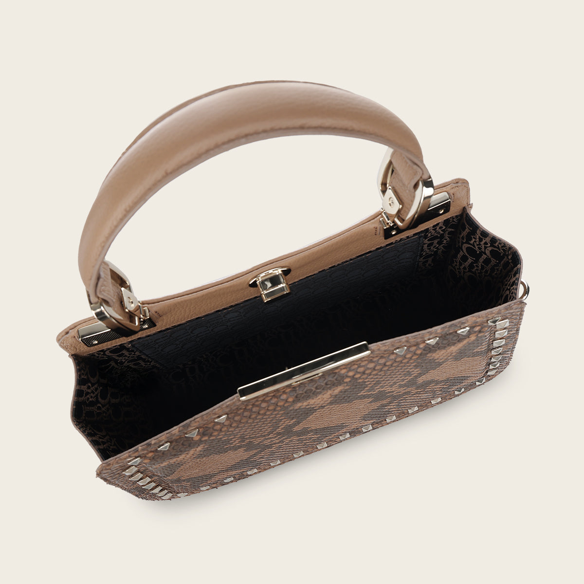 Bolso de mano para dama en piel genuina de pitón y piel de bovino con combinación de colores. Presenta aplicación de estoperoles en el margen al frente y atrás. Asa corta y asa