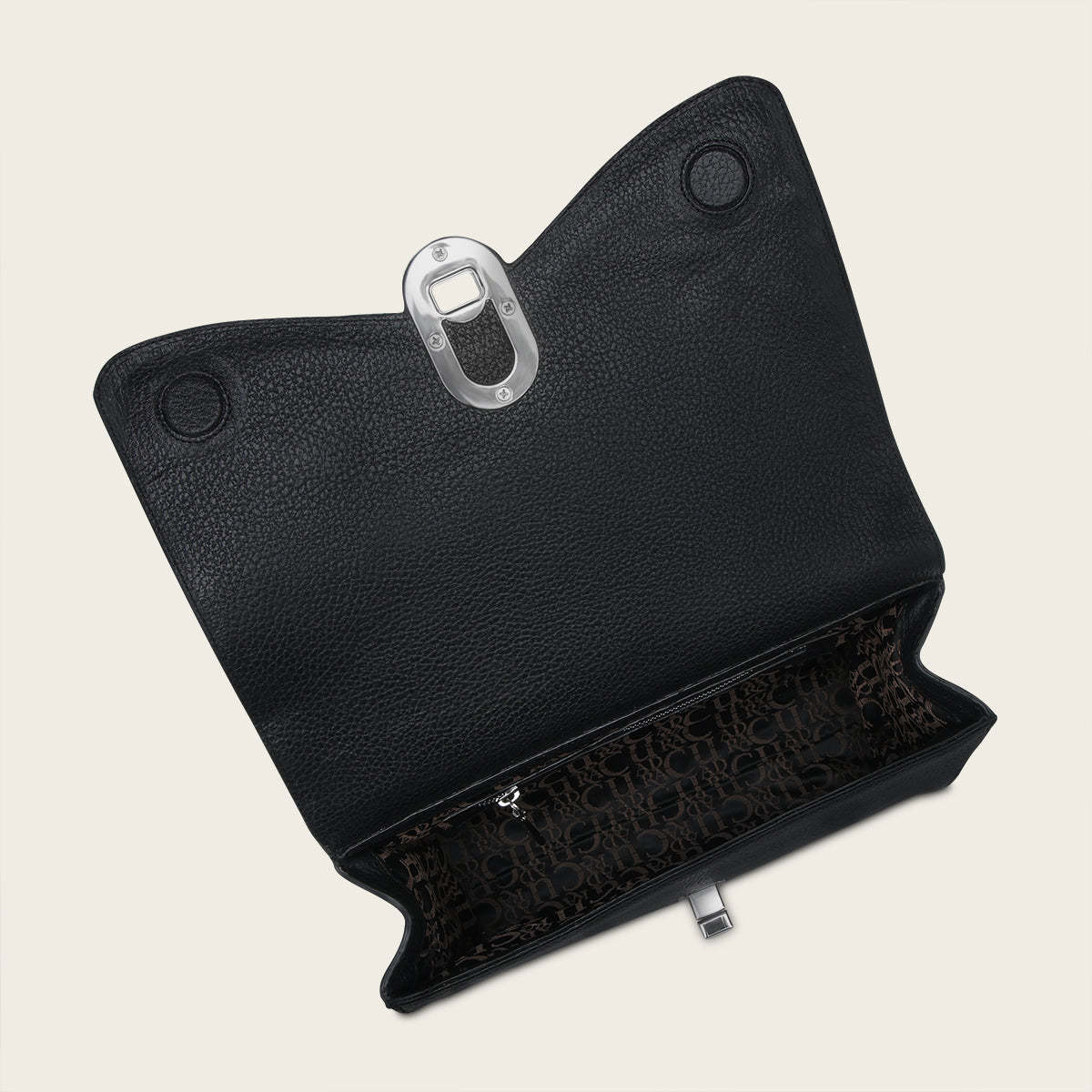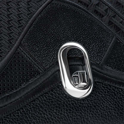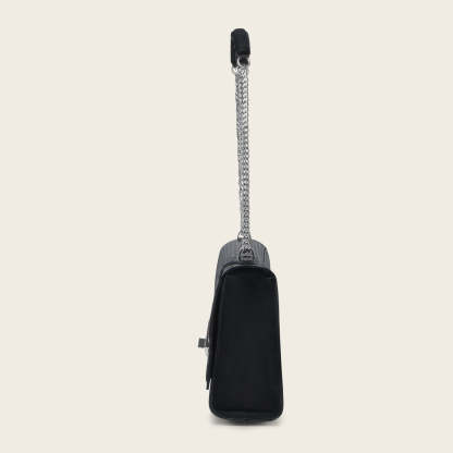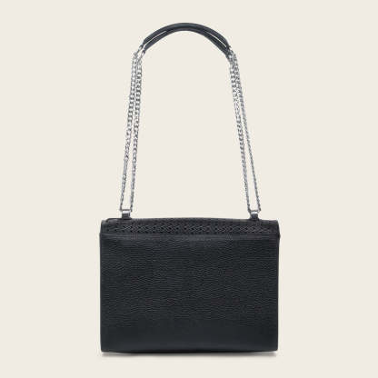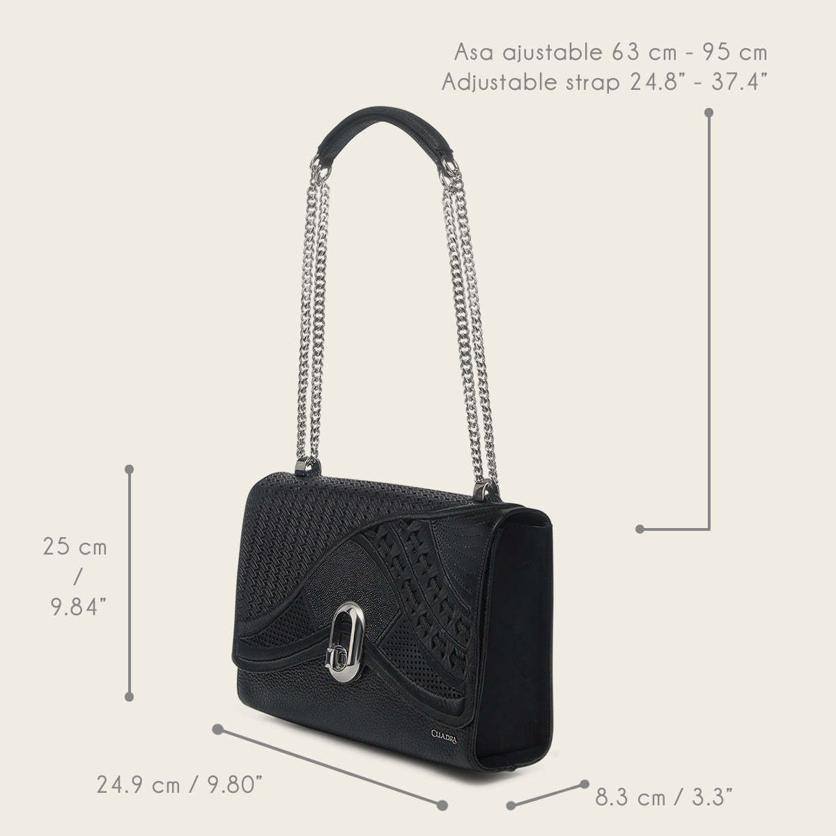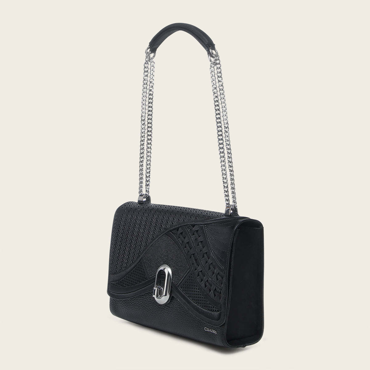 Bolso de hombro para dama en piel genuina de mantarraya y piel de bovino. Presenta grabado láser, bordado, tejido en alto relieve, trenza de textil. Dos compartimentos internos, uno asegurado con cierre. Ajuste con broche metálico. Con asa de cadena doble que puede alargase para usar como crossbody. Asegurado con broche.