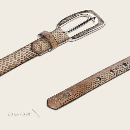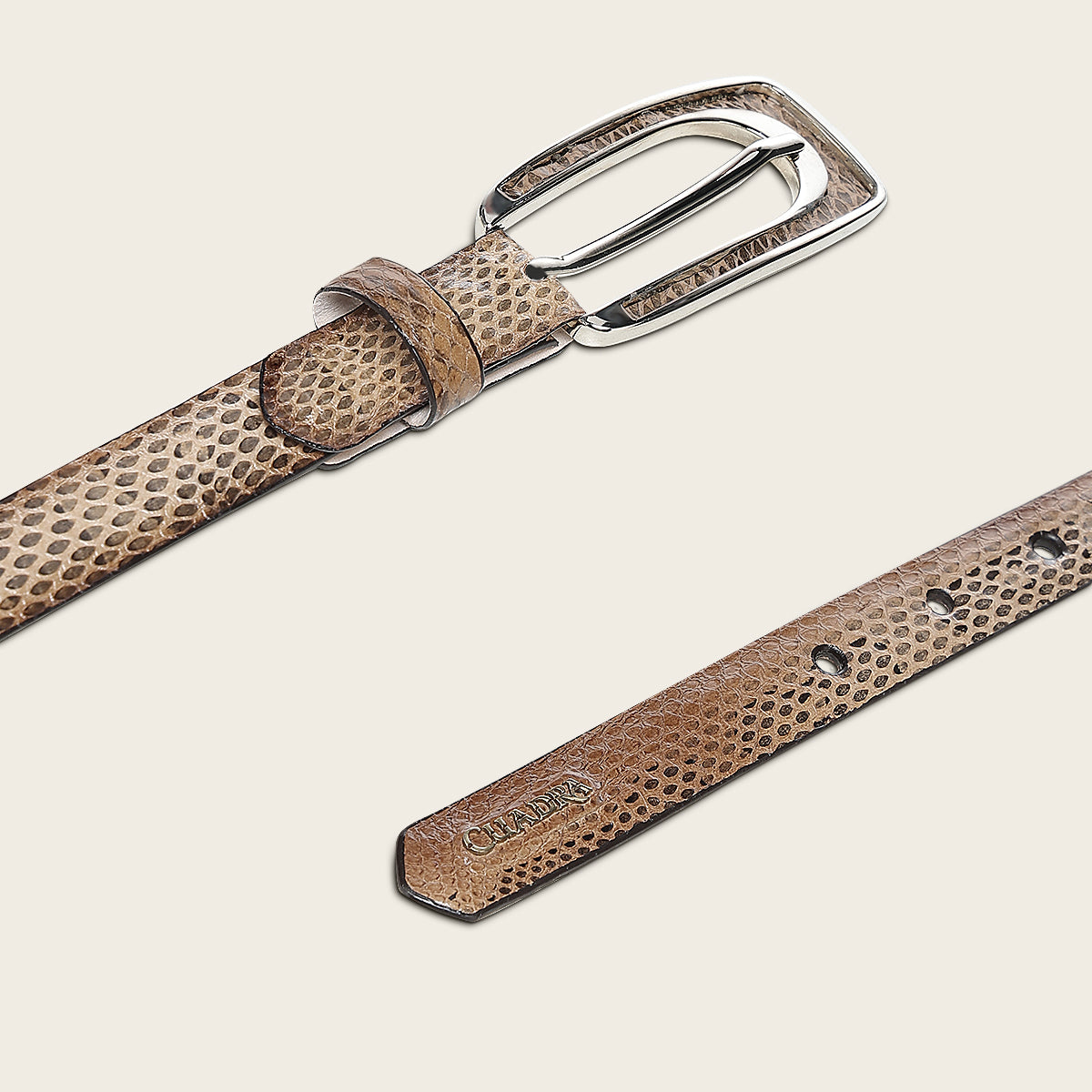 Cinturón casual para dama en piel genuina de buccata. Presenta aplicación metálica de logotipo Cuadra y hebilla de 20 mm forrada con piel de buccata. Con forro en piel de bovino.