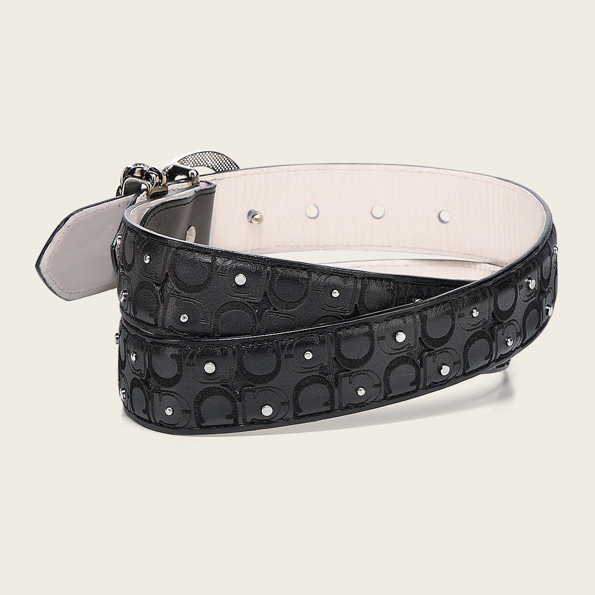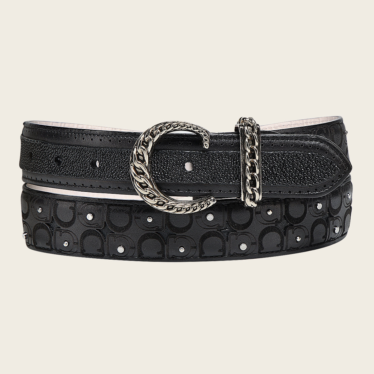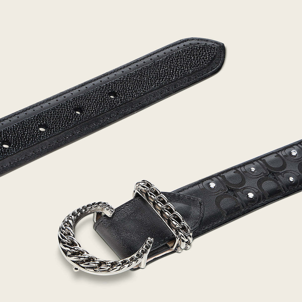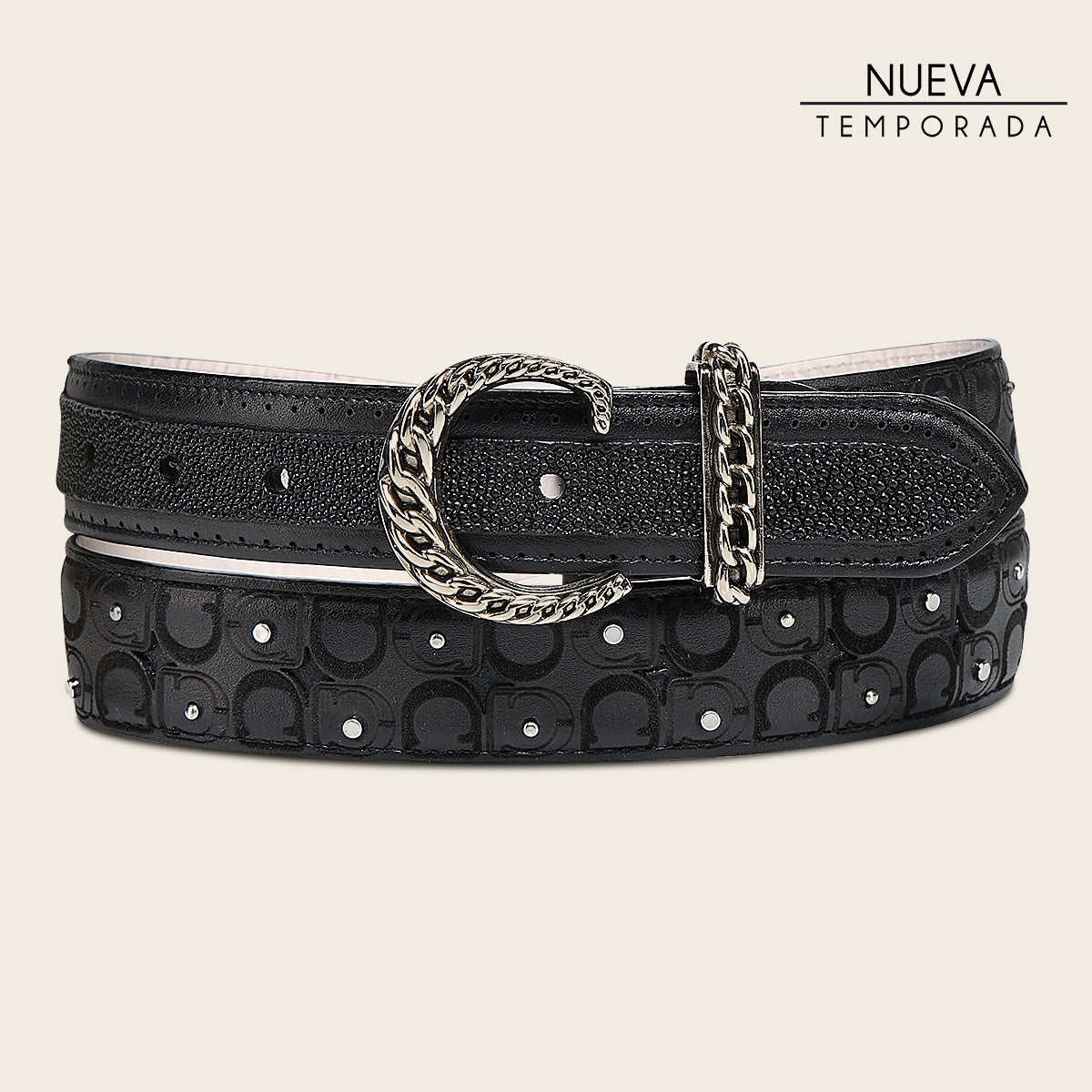 Cinturón para dama en piel genuina de mantarraya y bovino. Con técnica de perforado y grabado láser. Con estoperoles metálicos. Hebilla personalizada de 35 mm, con motivos de cadena.