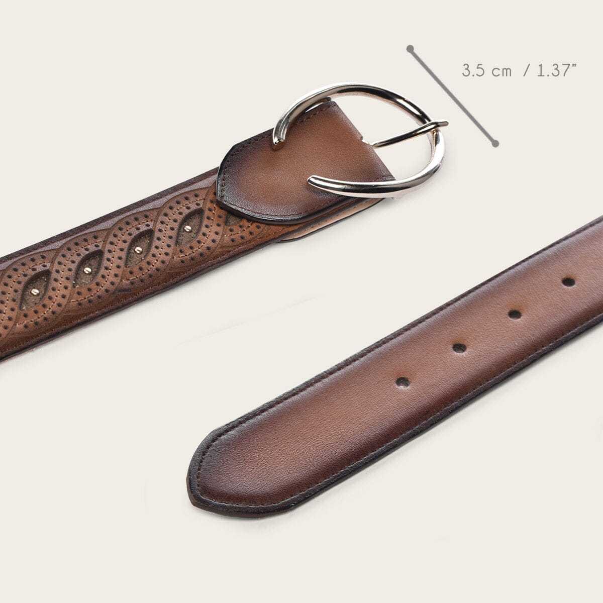 Cinturón para dama en piel genuina de bovino. Presenta una técnica de perforado y grabado láser. Adornado con pequeños estoperoles metálicos. Color miel.