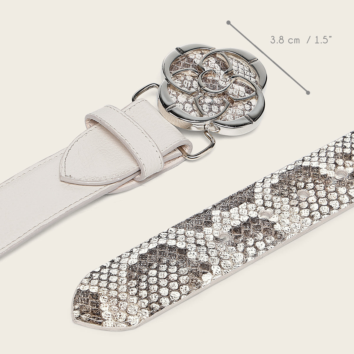 Cinturón para dama en piel genuina de pitón y piel de bovino. Hebilla metálica de 38 mm con monograma de Cuadra. Con forro en piel de bovino.