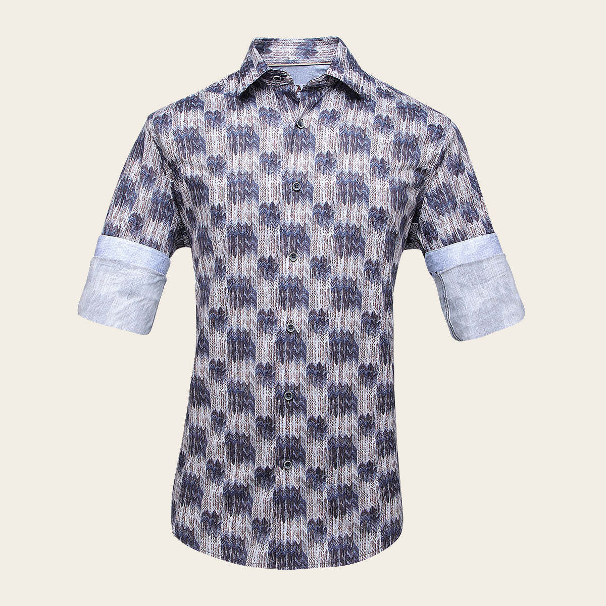 Camisa Cuadra para caballero. Presenta estampado en motivos geométricos y colores contrastantes. Ajustada por medio de botones en mangas y al frente.
