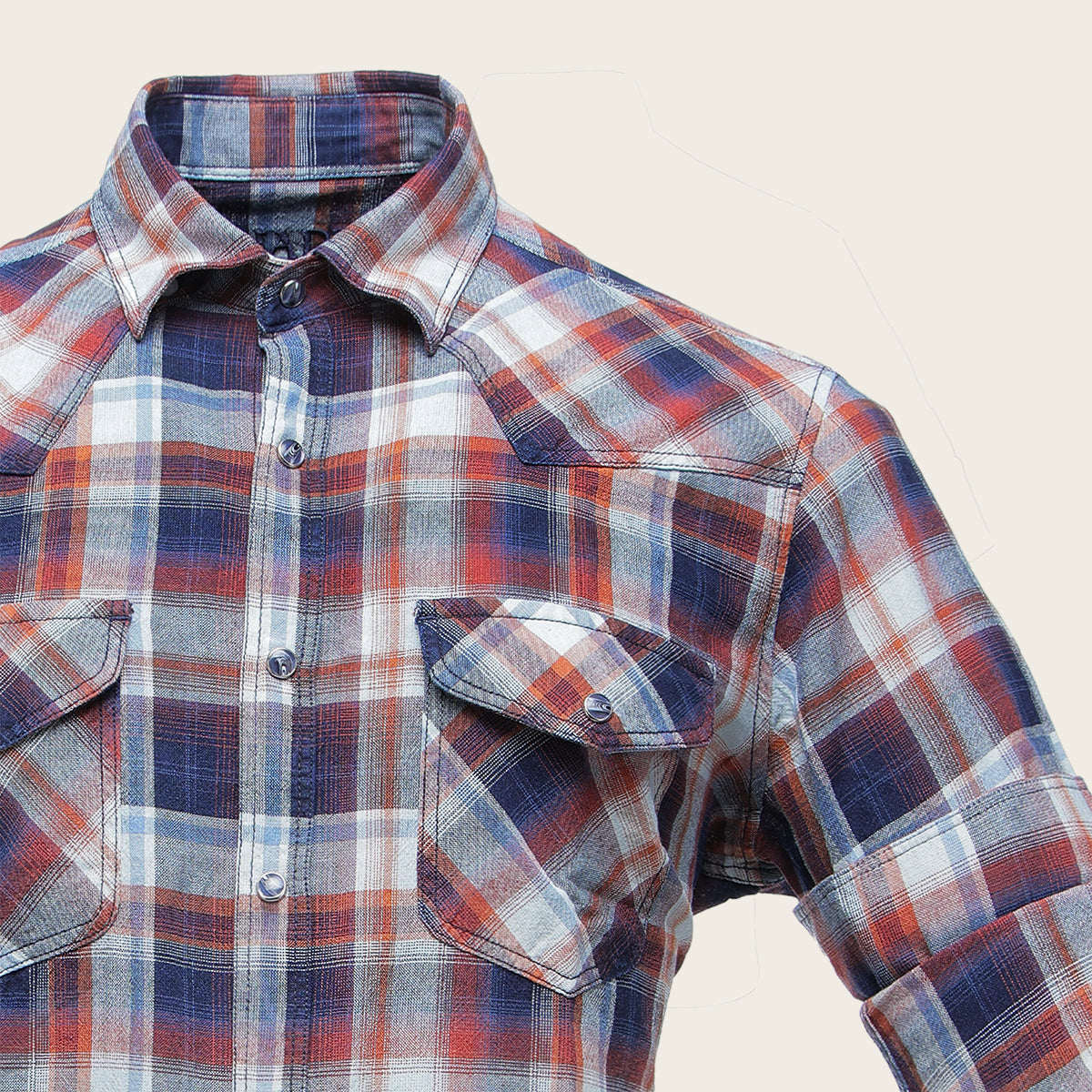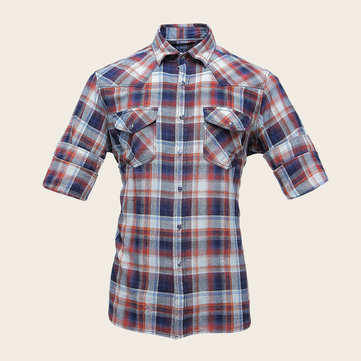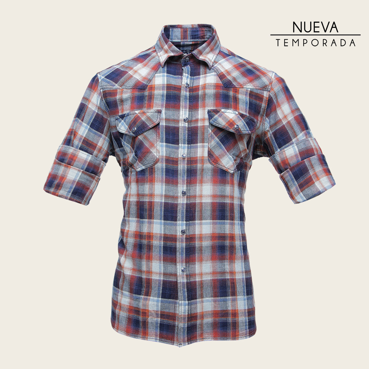 Camisa Cuadra para caballero. Presenta estampado de cuadros en contraste de color y dos bolsillos en pecho asegurados con broche. Ajuste con broches al frente y en mangas.