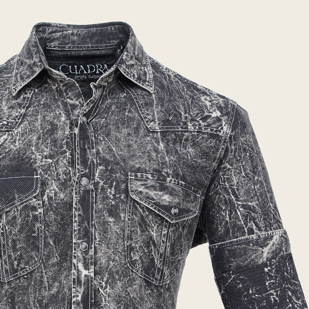 Camisa Cuadra para caballero. Presenta estampado en contraste de color y dos bolsillos en pecho asegurados con broche. Ajuste con broches al frente y en mangas.