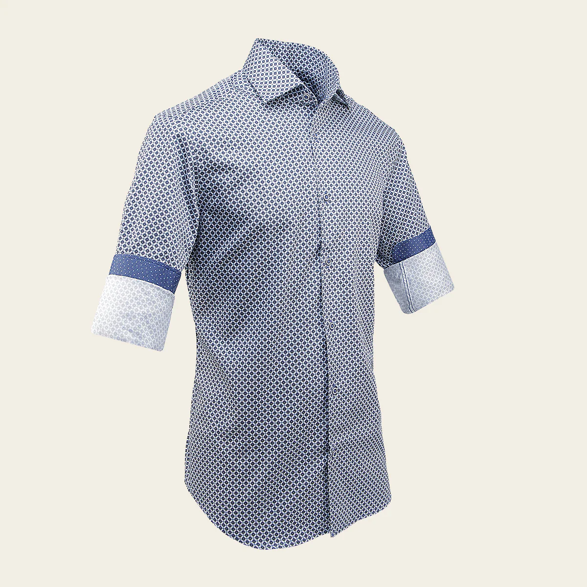 Camisa Cuadra para caballero. Presenta textura geométrica de puntos en color azul y negro. Con logotipo Cuadra bordado en la parte interna.