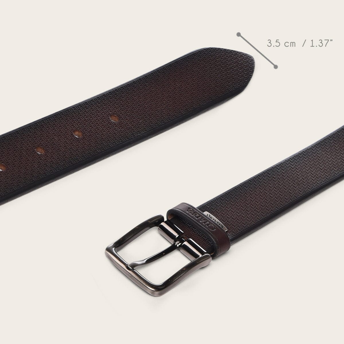 Cinturón para caballero en piel genuina. presenta sutil grabado de logotipo Cuadra. Hebilla metálica.