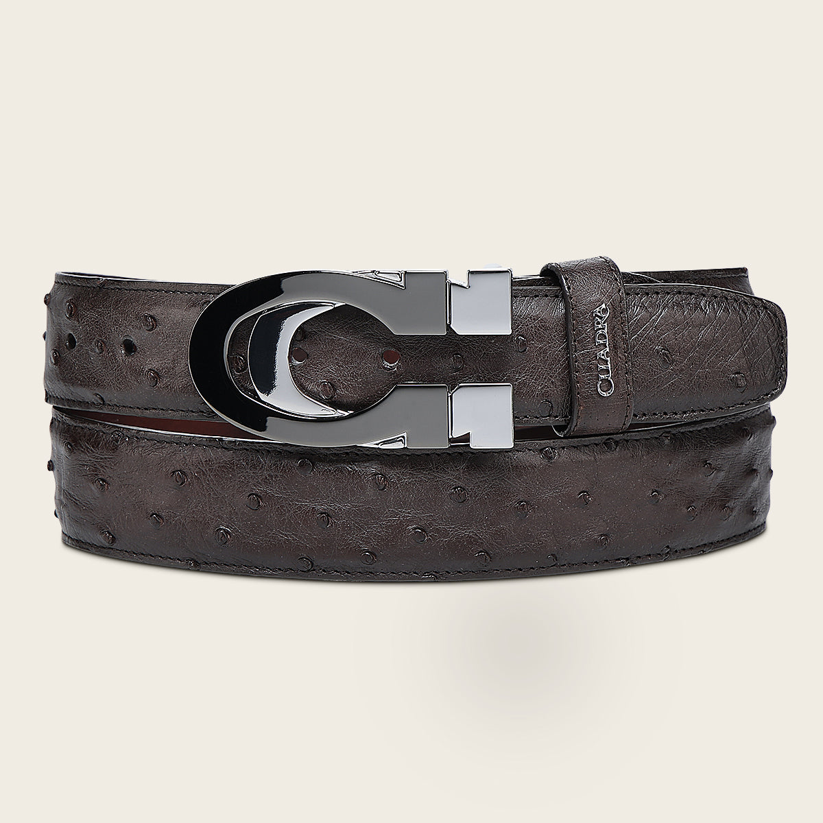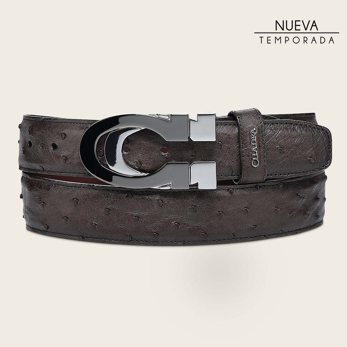 Cinturón casual para caballero en piel genuina de avestruz. Presenta aplicación metálica del logotipo Cuadra y hebilla doble del monograma Cuadra de 38mm. Con forro en piel de bovino.