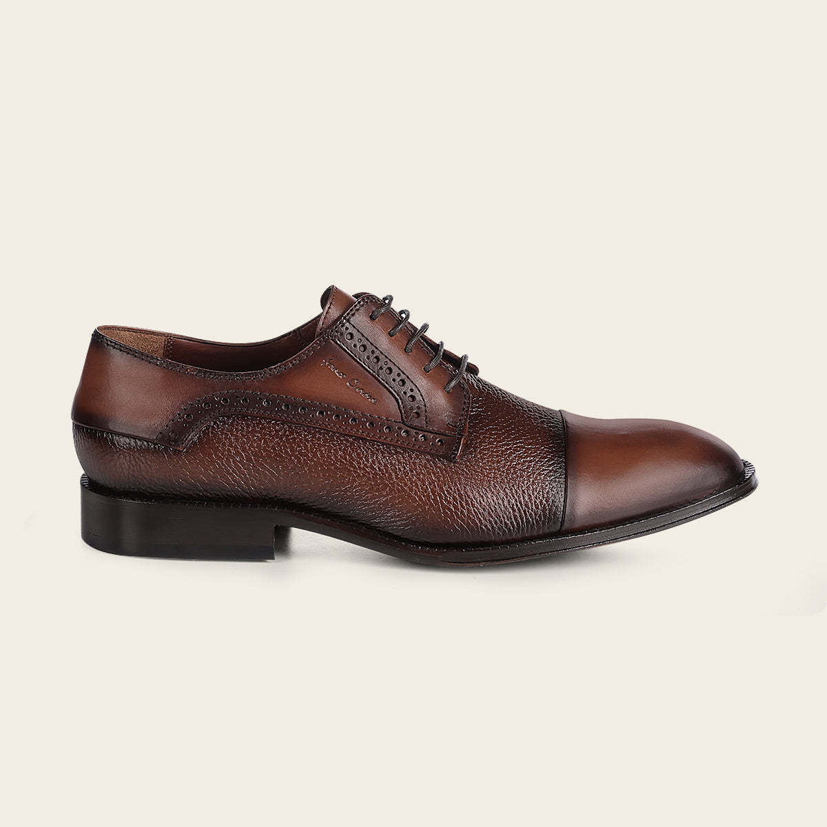 Zapato de vestir para caballero en piel genuina de venado y bovino. Presenta sombreado pintado a mano así como detalles de brocado y contraste de texturas. Cuenta con sutil grabado Franco Cuadra al costado. Ajustados con agujetas. Suela de de cuero con injerto de TPU.