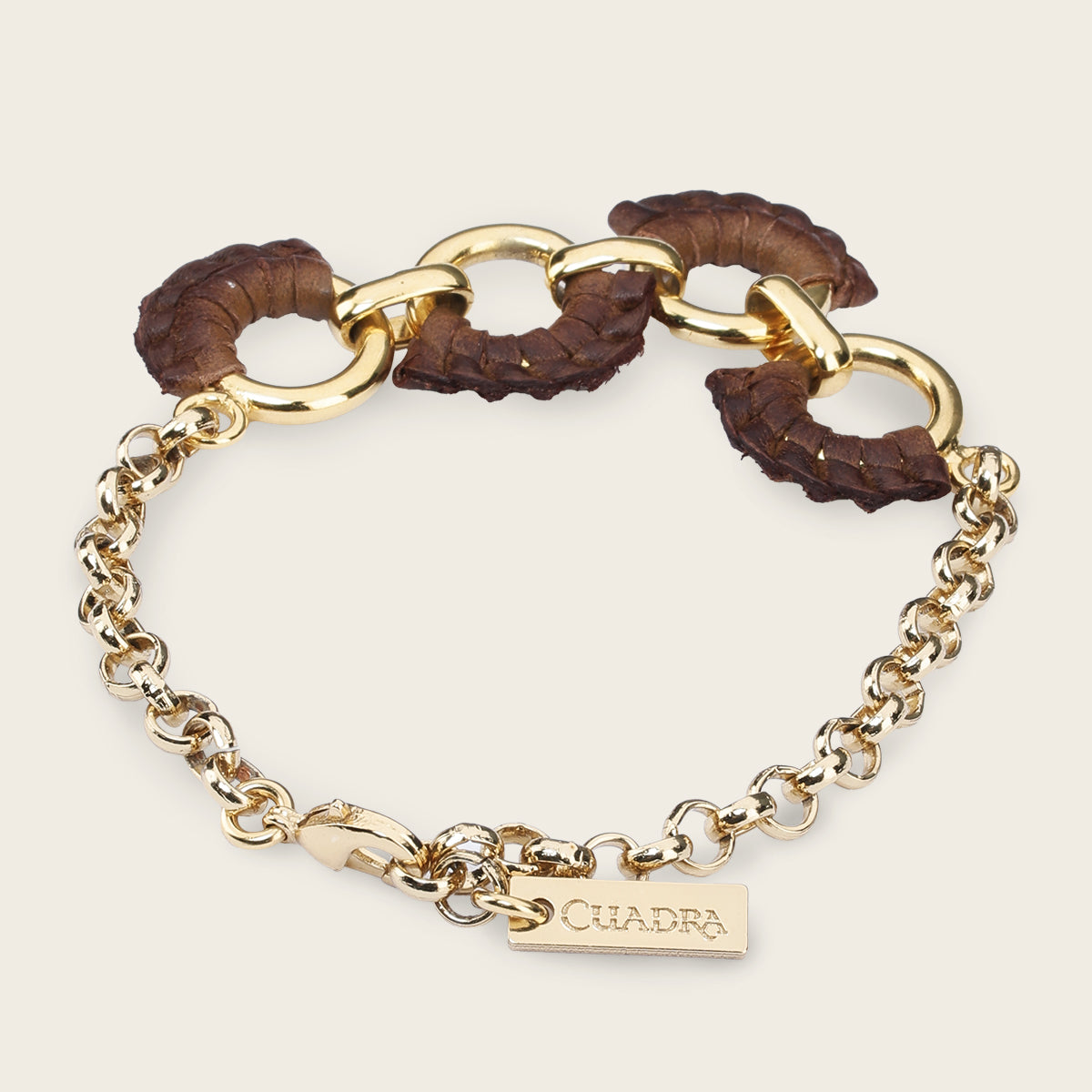 Pulsera para dama de latón en baño de oro, tejido de manera artesanal con piel de bovino. Cuenta con componente Cuadra con acabado oro. Ajustada con broche metálico.