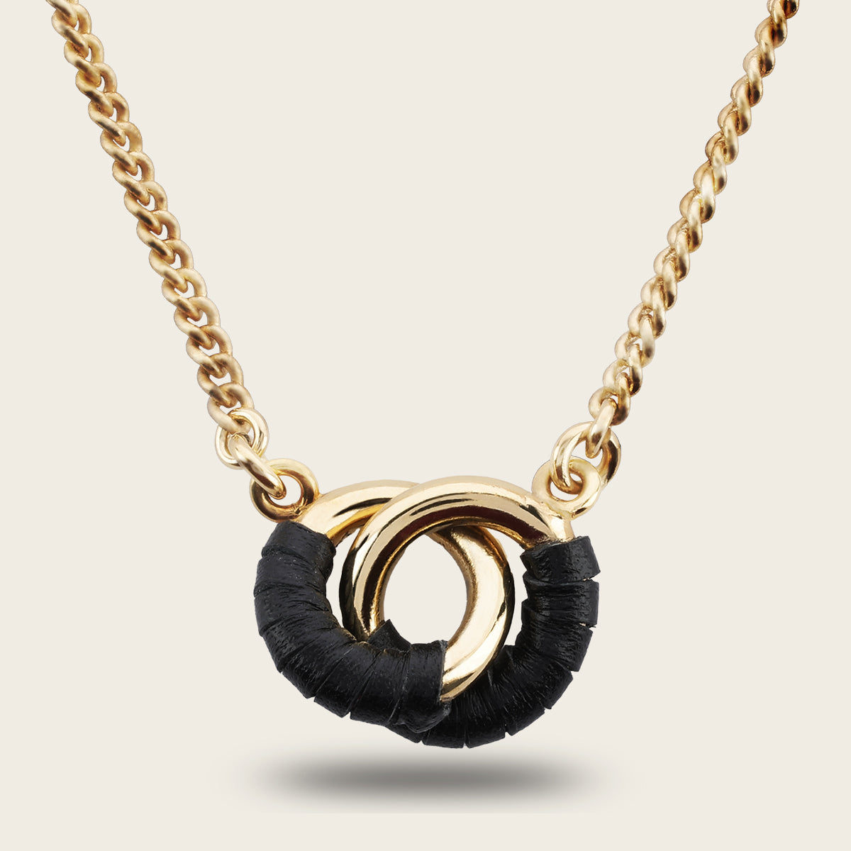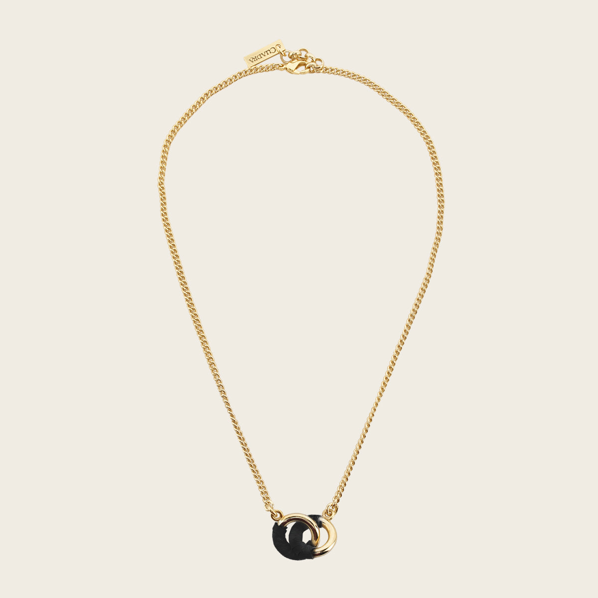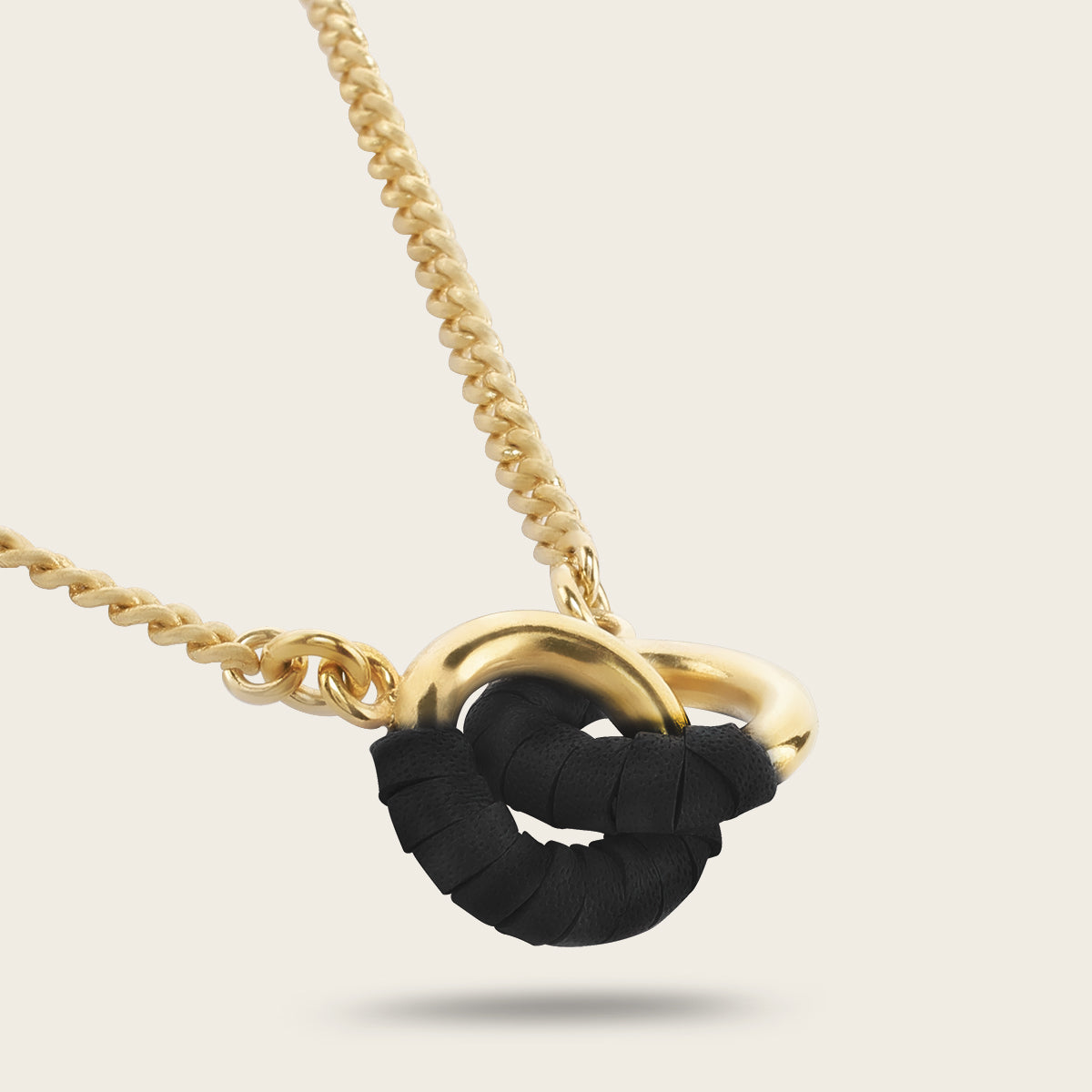Collar para dama en tumbaga con baño de oro. Presenta tejido de manera artesanal con piel de bovino. Cuenta con componente Cuadra con acabado oro.  Longitud aproximada de la cadena: 40 cm. Altura aproximada del dije: 2.5 cm