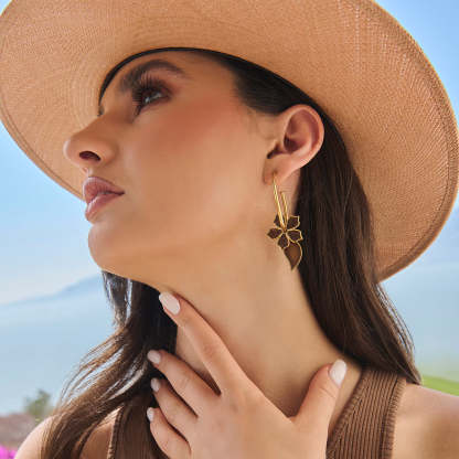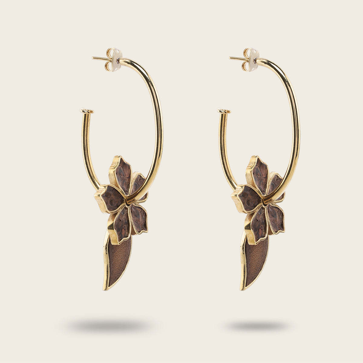 Aretes tipo arracada de 95% latón y 5% alpaca con baño de oro. Presenta dije de flor móvil forrada con piel genuina de pitón y piel de bovino. Altura aproximada del arete: 6.5 cm.