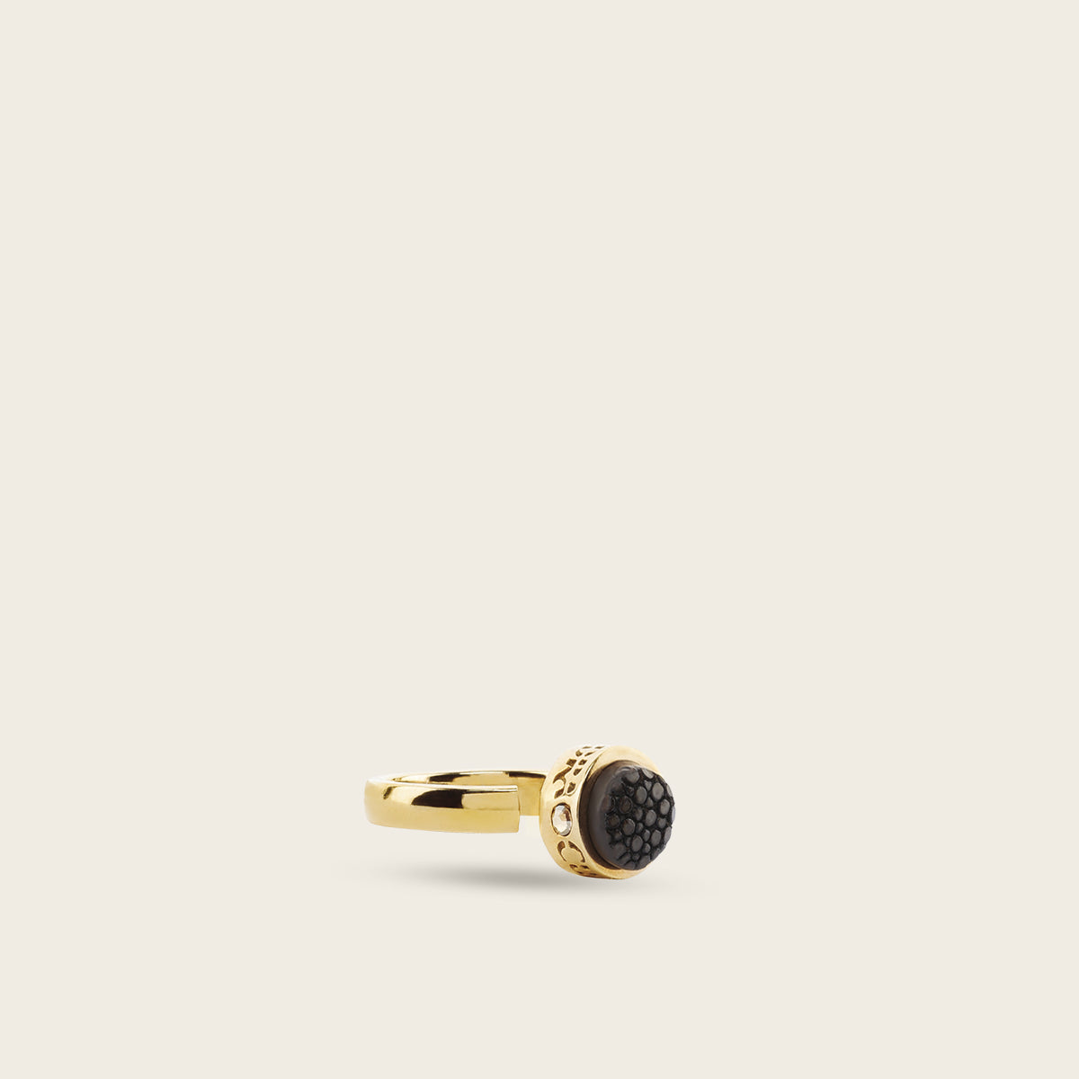 Anillo ajustable para dama de latón con baño de oro. Presenta aplicación de piel genuina de mantarraya pulida y cristales auténticos.
