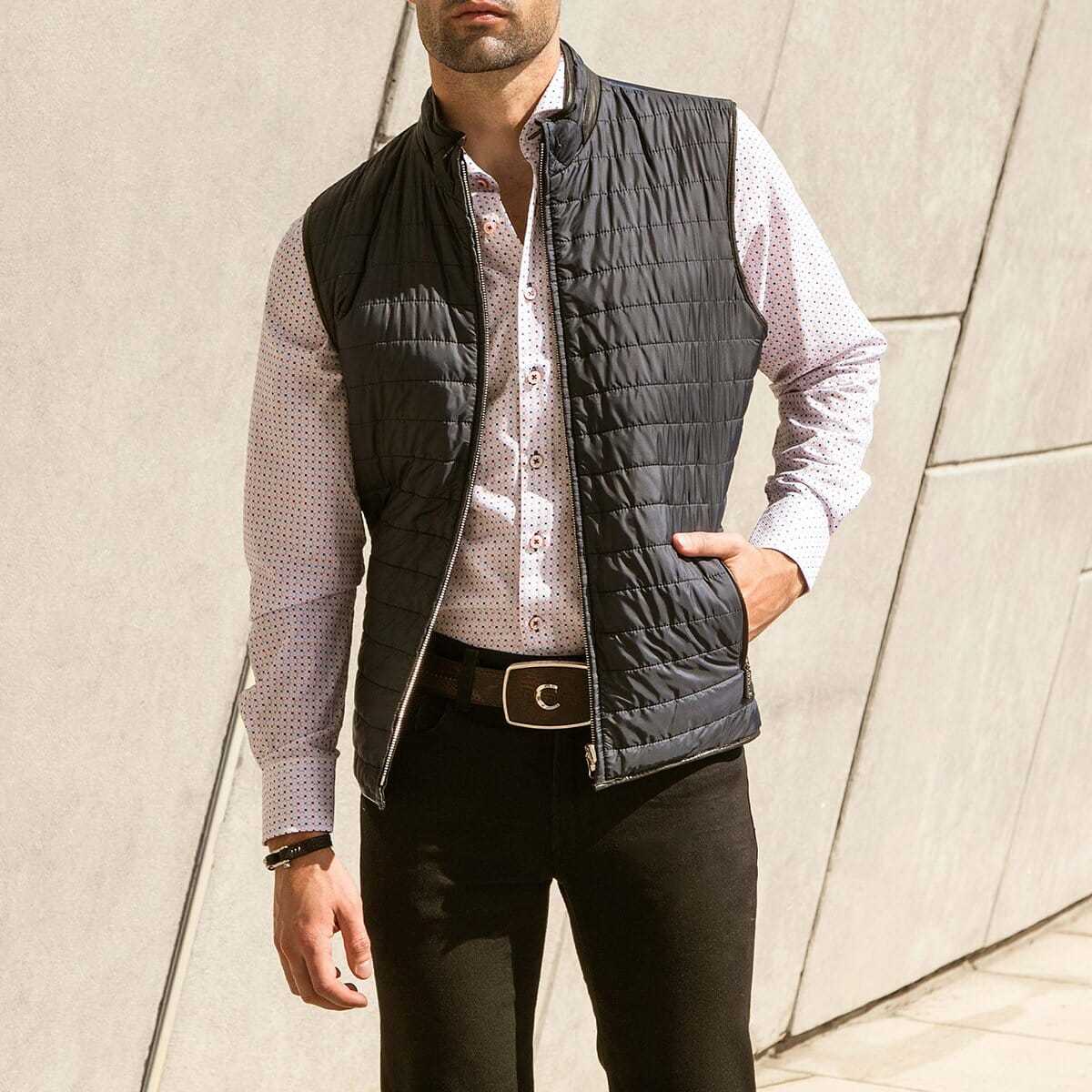 Chaleco para caballero con doble vista. juste por medio de cierre. Presenta dos bolsillos frontales ajustados con cierre.