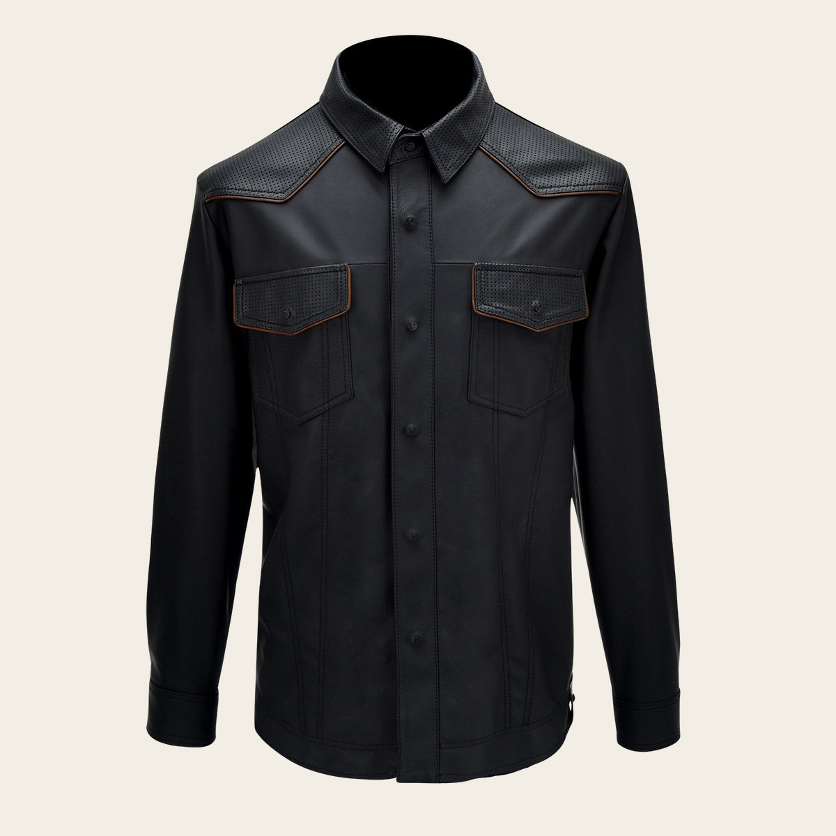 Camisola para caballero en piel genuina de ovino. Cuenta con dos bolsillos frontales asegurados con botón, con perforado en piel y franjas en contraste de color. En hombros y cuello cuenta con aplicación de piel perforada y con bordes en contraste de color. Ajuste por medio de botones.