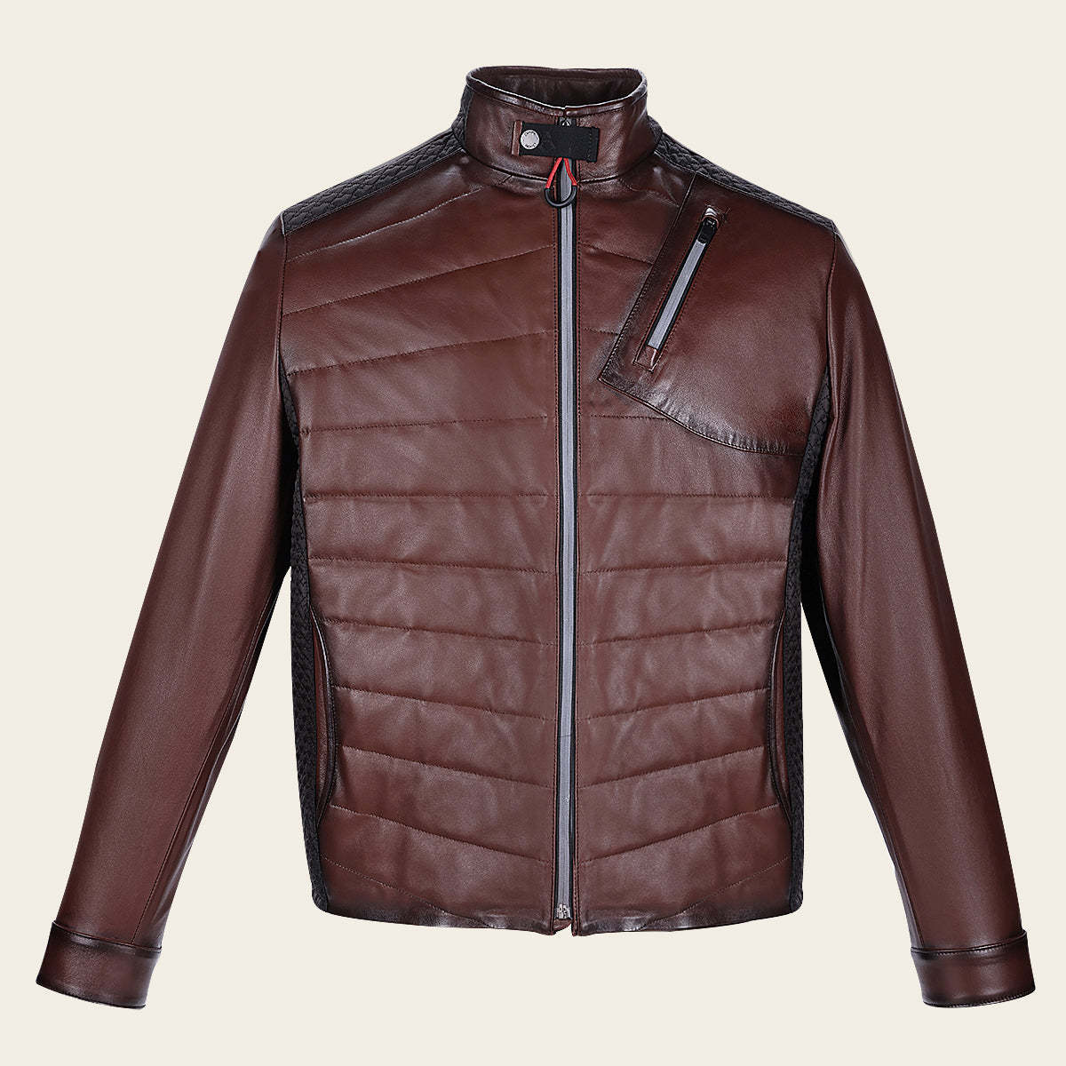 Chamarra para caballero en piel genuina de ovino. Con bordado capitonado y aplicaciones textiles con bordado capitonado en los hombros y costados. Cierres enmarcados con aplicaciones reflejantes. Cuenta con dos bolsillos laterales, un bolsillo en el pecho asegurado con cierre y dos bolsillos internos. Ajustado con cierre frontal. Color café
