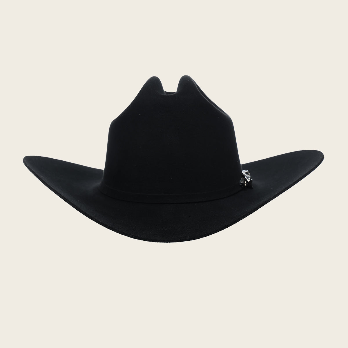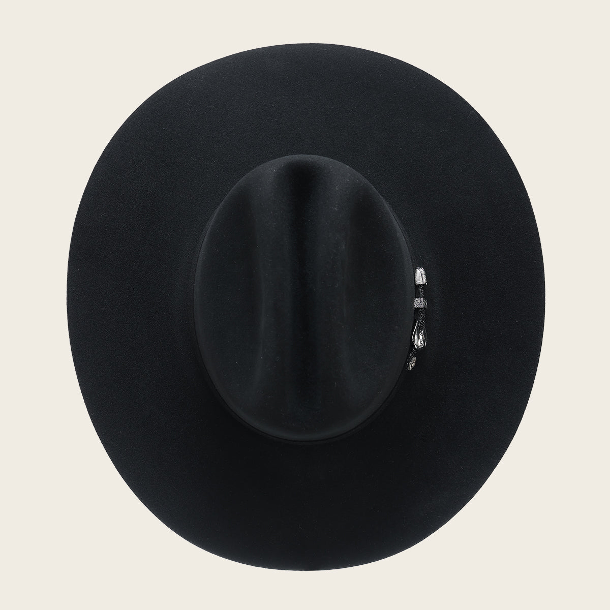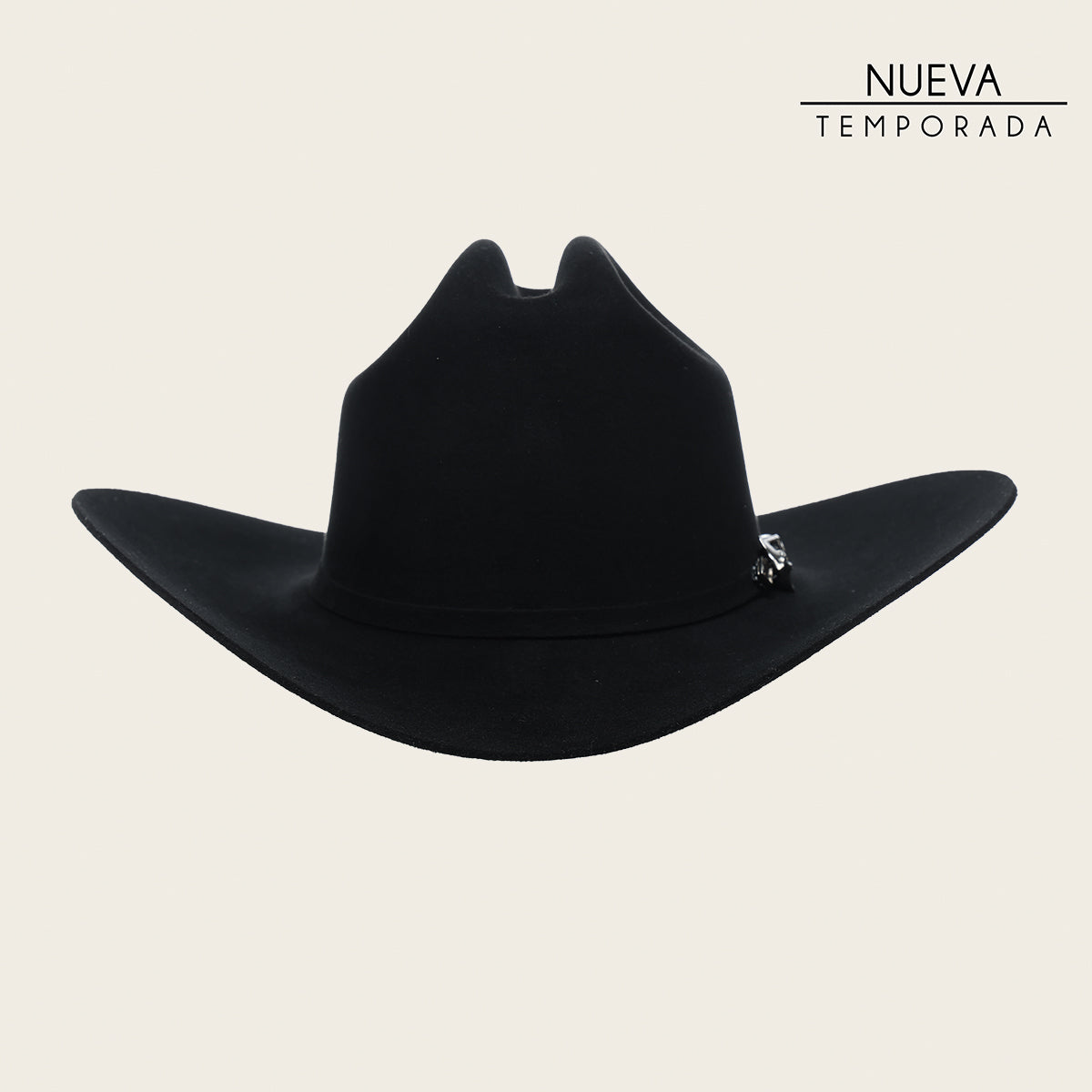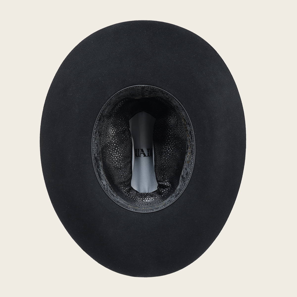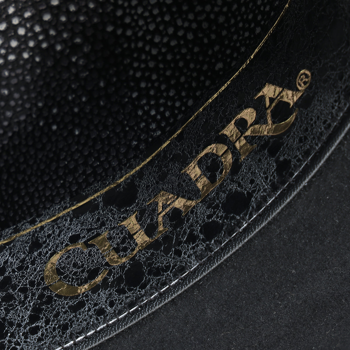 Sombrero Cuadra en pelo de castor y conejo. Hecho a mano, con toquilla en piel de mantarraya. Presenta hebilla de tres piezas con diseño de mantarraya. Con tafilete en piel genuina de cabra. Forro con diseño de mantarraya. Ala de 4 pulgadas.